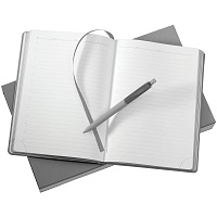 Начнем с организационных аксессуаров - блокнотов, ручек и бейджей: