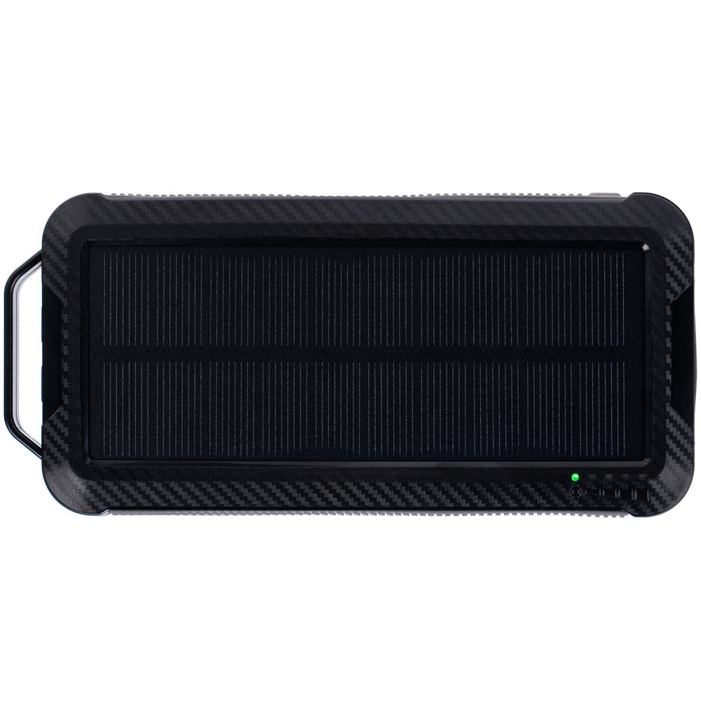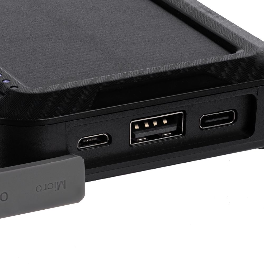 Прорезиненные вставки и рисунок на корпусе с имитацией карбона добавляют хорошей агрессивности внешнему виду аккумулятора — сразу видно, что его хозяин готов к приключениям.- Литий-полимерный аккумулятор