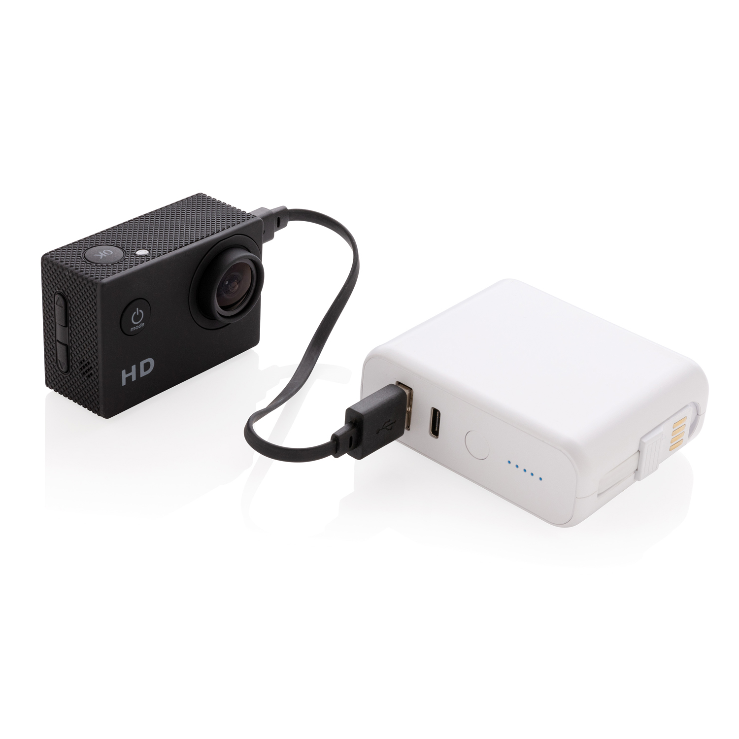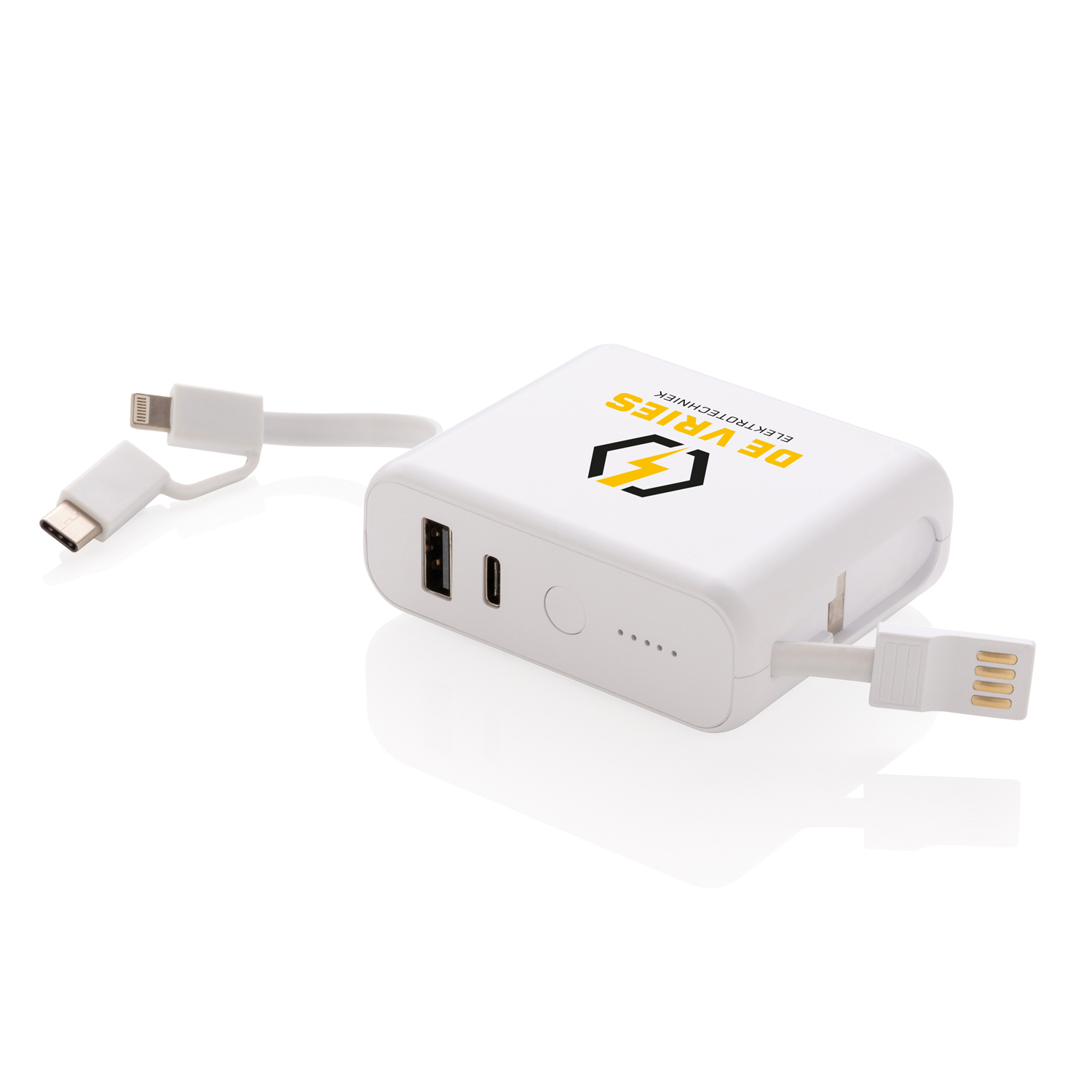 Аккумулятор белого цвета c 5 светодиодными индикаторами, упакован в коробку XD collection.