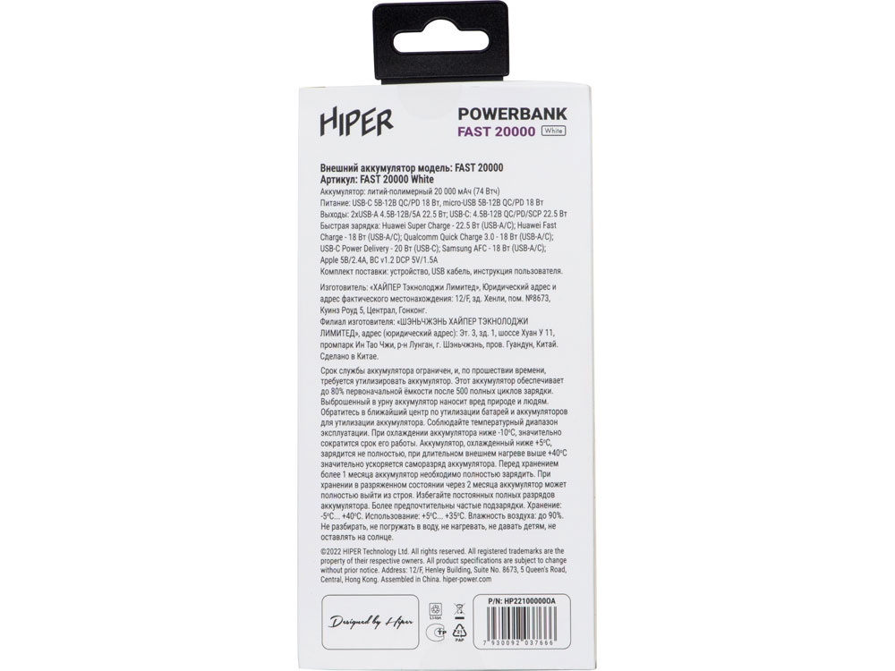 Портативный внешний аккумулятор HIPER FAST 20000 емкостью 20000 мАч (74Втч) оснащён двунаправленным портом USB-C, Micro-USB входом для зарядки, с поддержкой быстрой зарядки аккумулятора QC и PD, 2xUSB-A выходами, максимальный выходной ток 5А, максимальная мощность 22,5 Вт, поддержка быстрой зарядки стандарта QC 18 Вт, поддержка быстрой зарядки стандарта PD 18 Вт, стильный дизайн. -