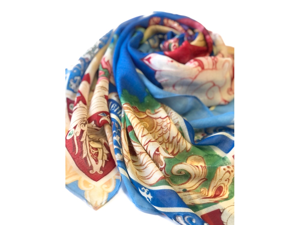 Прочитав сказку юного дарования, сам великий Александр Сергеевич Пушкин сказал: Этот род сочинений я могу теперь оставить - и Петр Ершов был принят в круг петербургских писателей.В этом году сказке из золотого фонда русской литературы, переведенной на все языки мира, исполняется 185 лет. Ее яркие краски мы перенесли на шелк и создали платок Конек-Горбунок. Благодаря тонкой работе дизайнера, со страниц книги, как живые, сошли герои любимой с детства истории: Иван, прекрасная Царь-девица и волшебный Конек-Горбунок. А в роскошных орнаментах сплелись легендарное перо Жар-птицы, Красное Солнышко и Месяц…