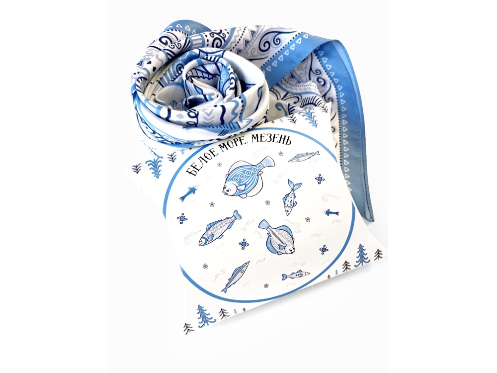 Платок из коллекции бренда Русские в моде посвящён уникальному искусству этой росписи. Изображения спиралевидных орнаментов в виде волн, елочек, рыбок украшают дизайн. Все это означает плодородие стихий земли и воды, энергию солнца, богатство и процветание.