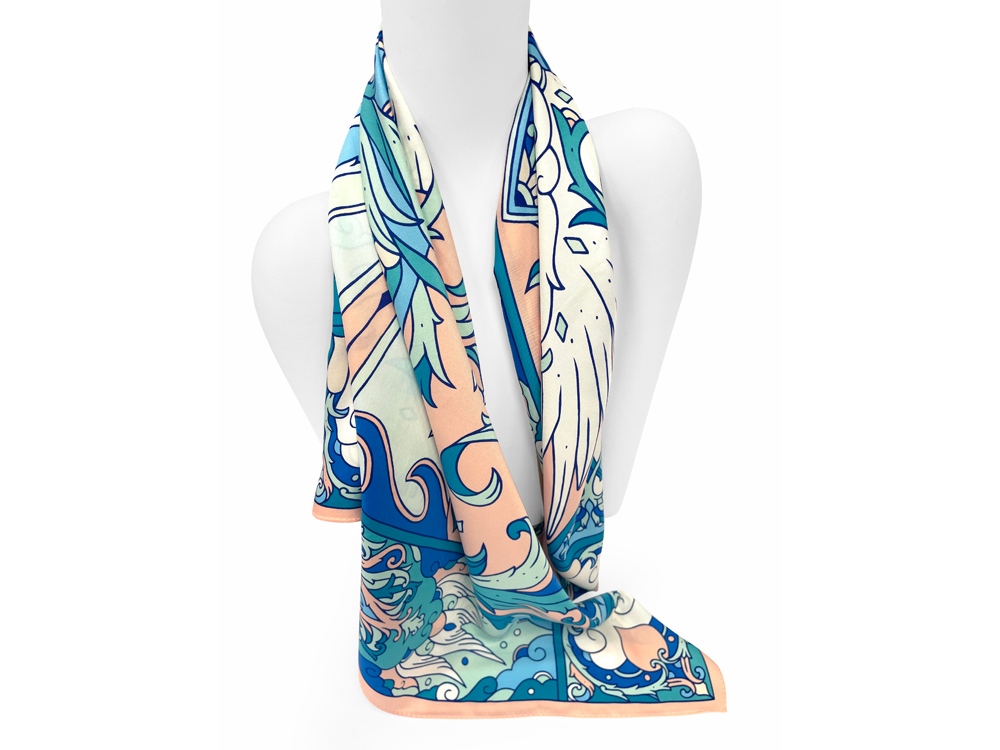 В центре авторского принта — удивительной красоты женщина с белоснежными крыльями, наделенная магическими способностями и житейской мудростью. Оригинальное сочетание тонов, цветочных орнаментов и русского колорита делают аксессуар нежным и самобытным.