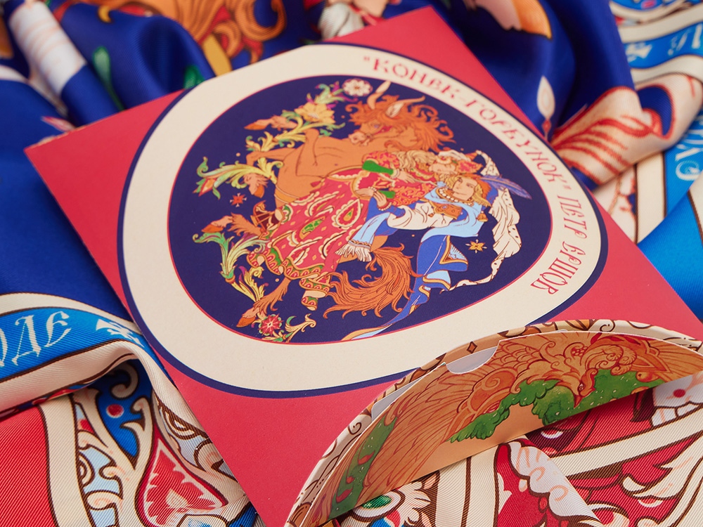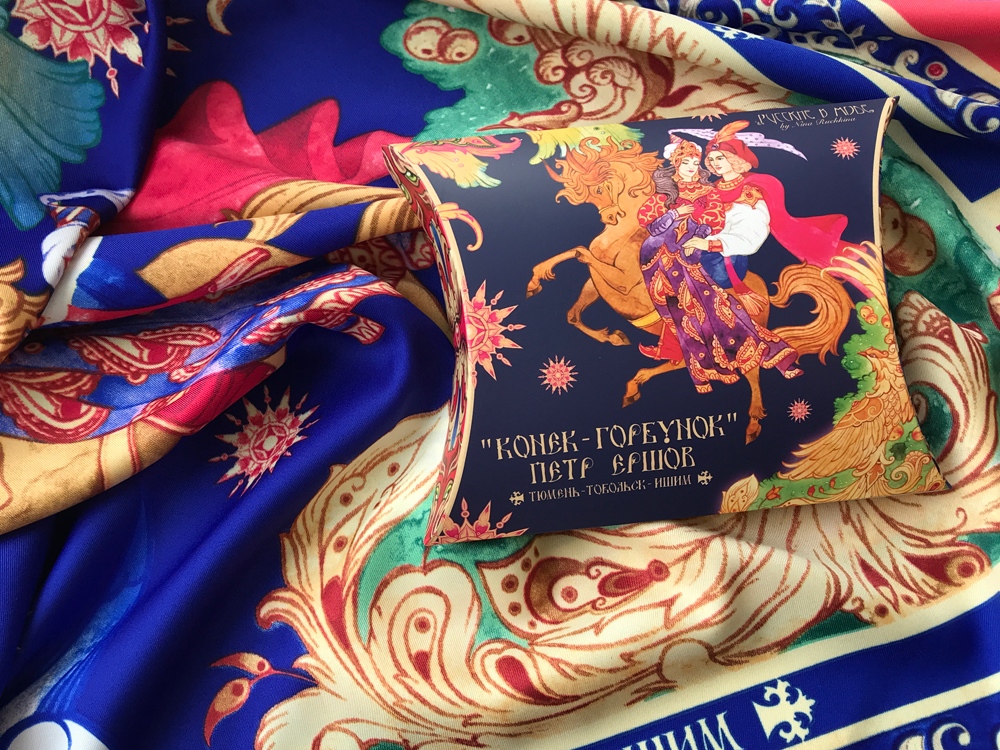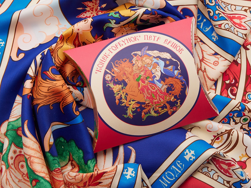 Прочитав сказку юного дарования, сам великий Александр Сергеевич Пушкин сказал: Этот род сочинений я могу теперь оставить - и Петр Ершов был принят в круг петербургских писателей.В этом году сказке из золотого фонда русской литературы, переведенной на все языки мира, исполняется 185 лет. Ее яркие краски мы перенесли на шелк и создали платок Конек-Горбунок.
