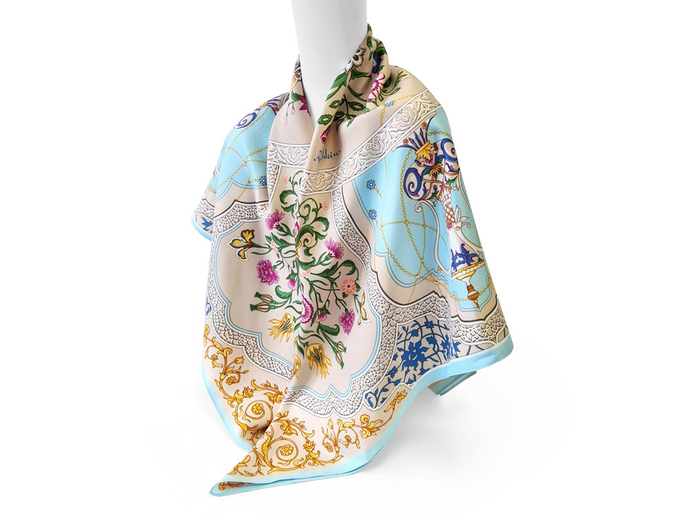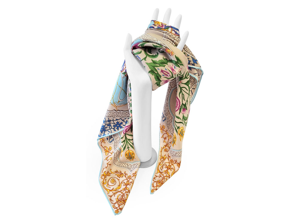 Принт аксессуара образуют знаменитые орнаменты востока — гирих (бесконечный узел”) и ислими (путь в божественный сад”). Непрерывные витиеватые линии в сочетании с узорами из гибких стеблей с зеленой листвой и пестрыми соцветиями завораживают, погружают в состояние медитации, постижения тайны мироздания через призму счастья и красоты.