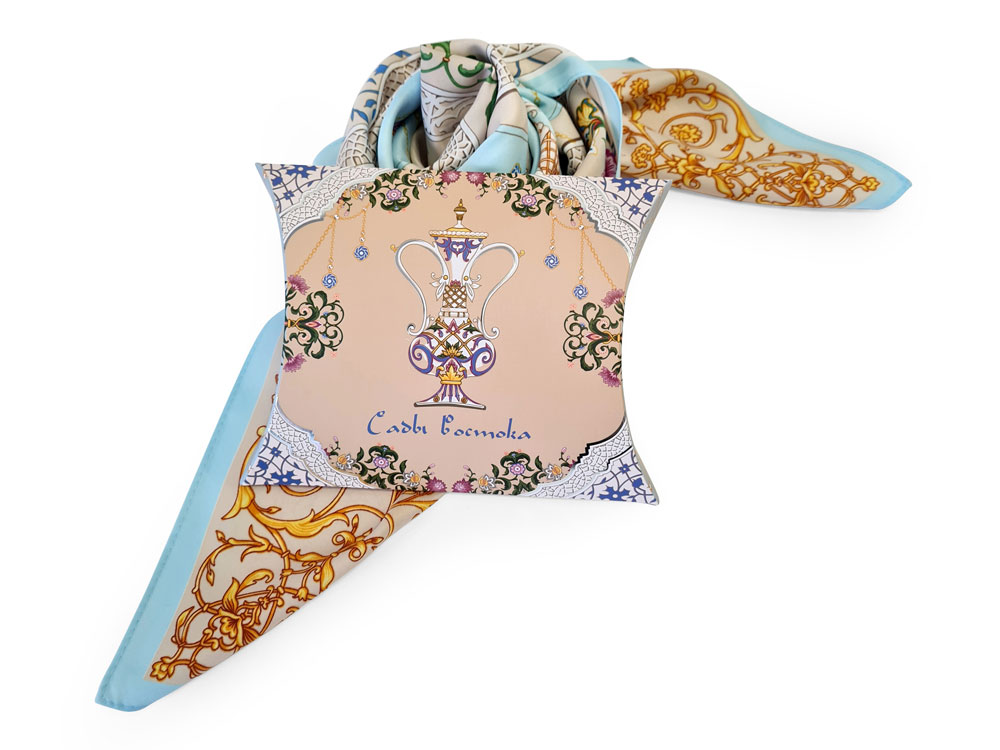 Платок Сады Востока от бренда Русские в моде” by Nina Ruchkina посвящен экзотической красоте, женской привлекательности и очарованию. В центре полотна расположились цветы дивного сада, олицетворяющие собой процветание, мир и земную любовь. Рядом изображены кувшины, наполненные росой молодости и секретами вечно цветущих восточных красавиц.