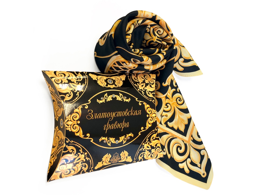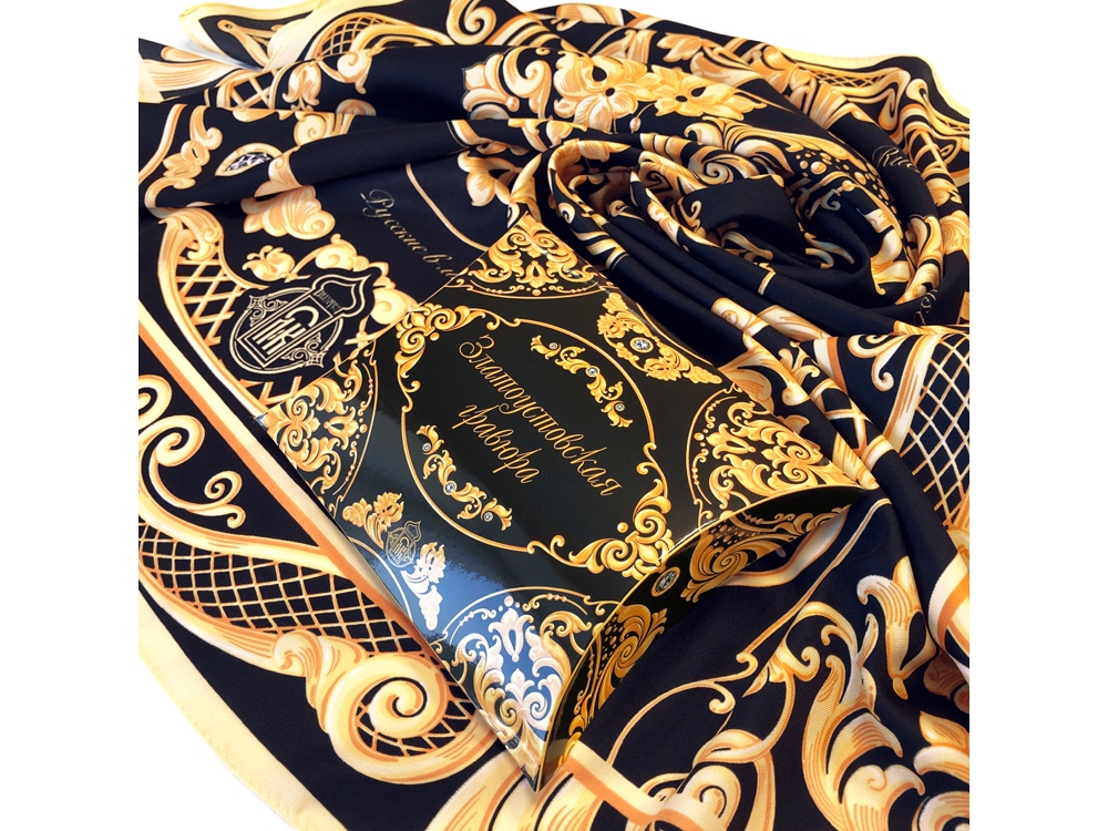 Дамы и господа, вы держите в руках платок Златоустовская гравюра, дизайн которого сделан совместно с авторами художественных мастерских Лик.