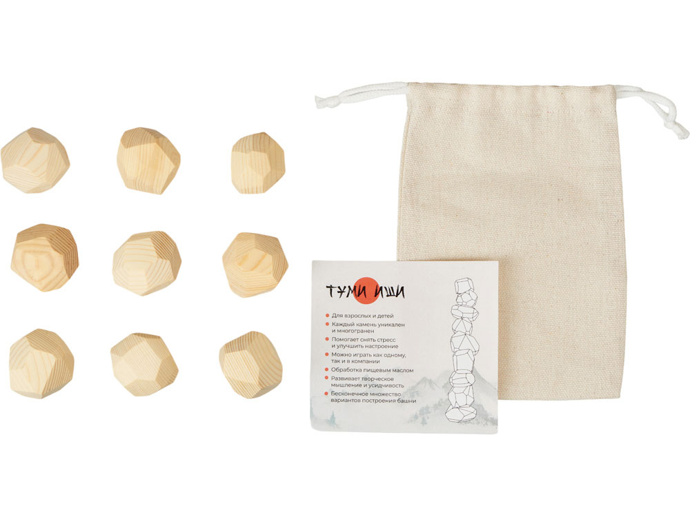 В комплекте также идёт мешочек из неокрашенного хлопка для хранения игры, на котором будет отлично смотреться ваш логотип!