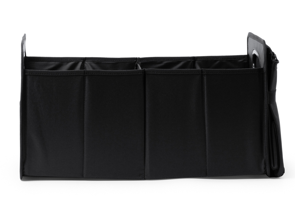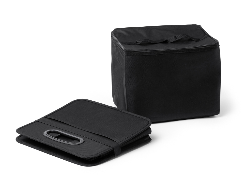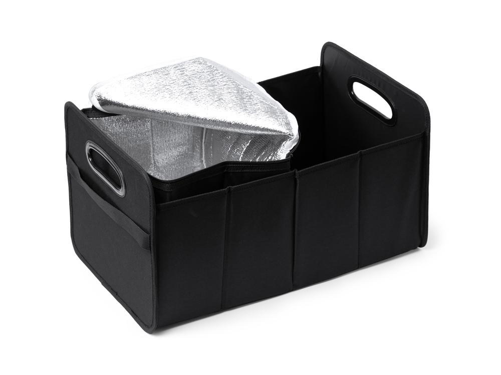 Складной органайзер для автомобиля из полиэстера 600D с усиленными ручками. Два основных отсека и внешний карман. Включает в себя съемный охладитель объемом 12 л с изотермической подкладкой. -