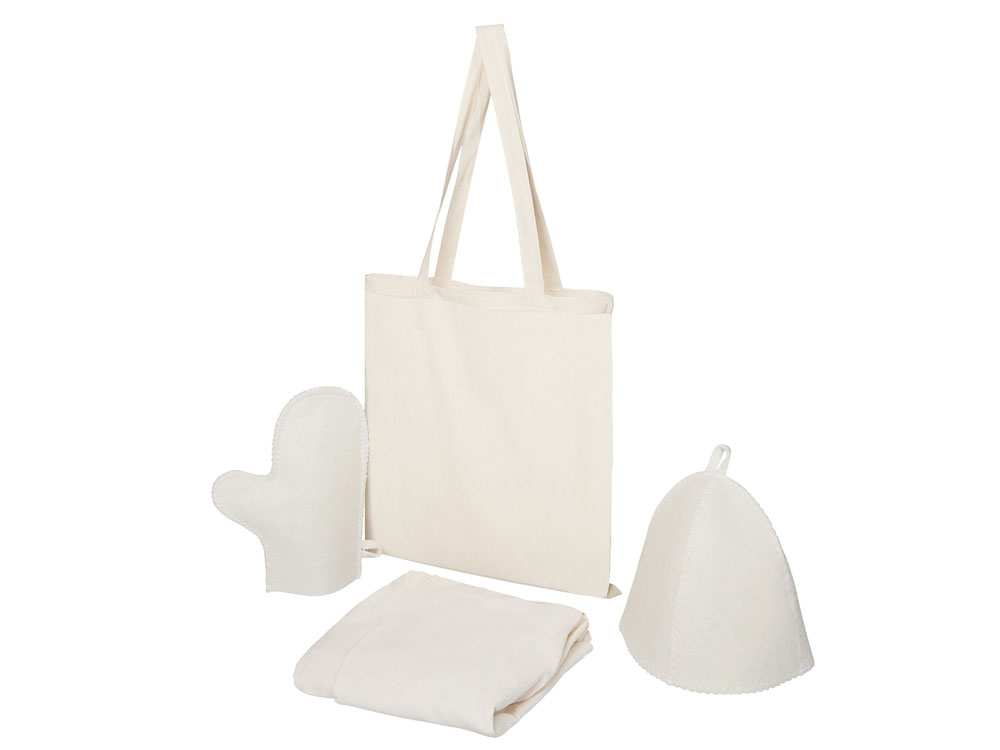 Создайте уют в парной: женский холщовый килт, шапка, коврик и рукавица — всё необходимое для отдыха, аккуратно сложено в хлопковый шоппер.