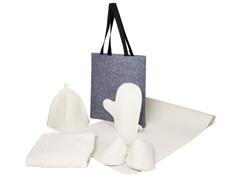 Женский банный набор Healing для комфортного отдыха: лежак для бани, холщовый килт-парео, рукавица, шапка и тапочки — всё аккуратно упаковано в стильный фетровый шоппер.