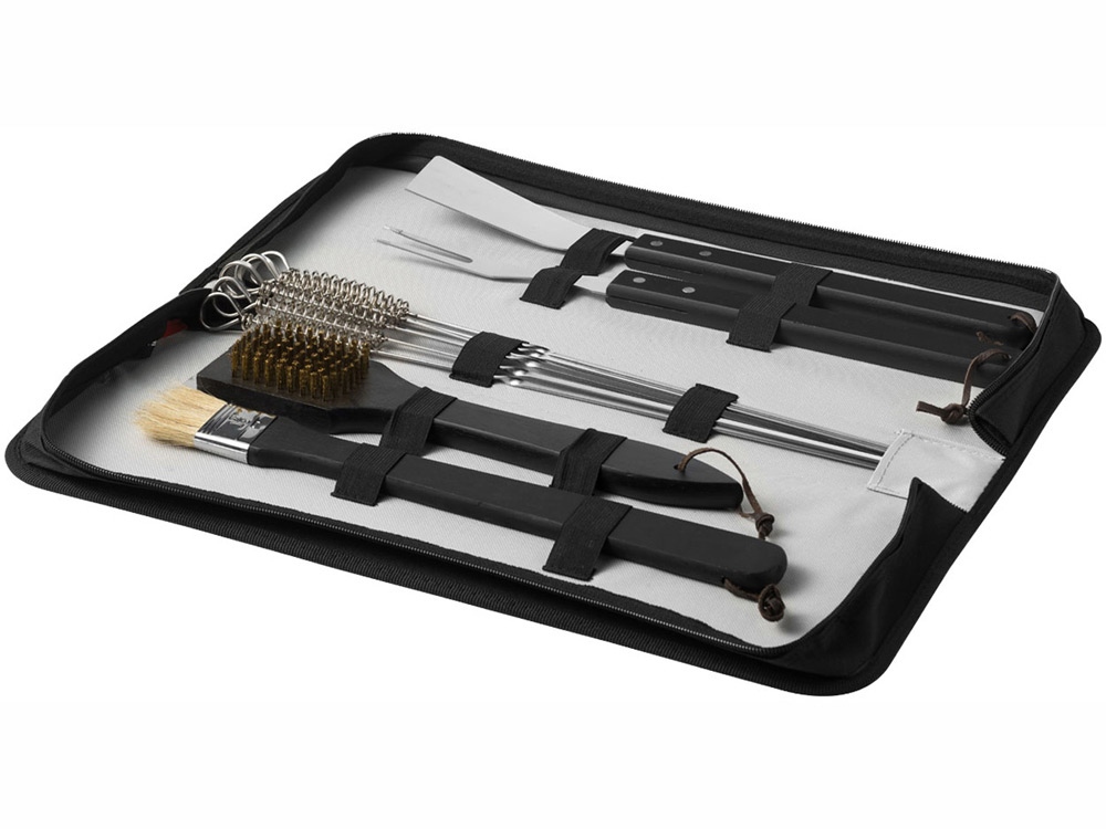 Набор для барбекю Asado из 11 предметов. Набор для барбекю включает лопатку для рыбы, кисть, вилку и щетку для очистки с деревянными ручками, шесть шампуров и чехол на молнии с передним карманом для нанесения. Нанесение не предлагается на отдельные элементы набора. Нержавеющая сталь и полиэстер 600D. -