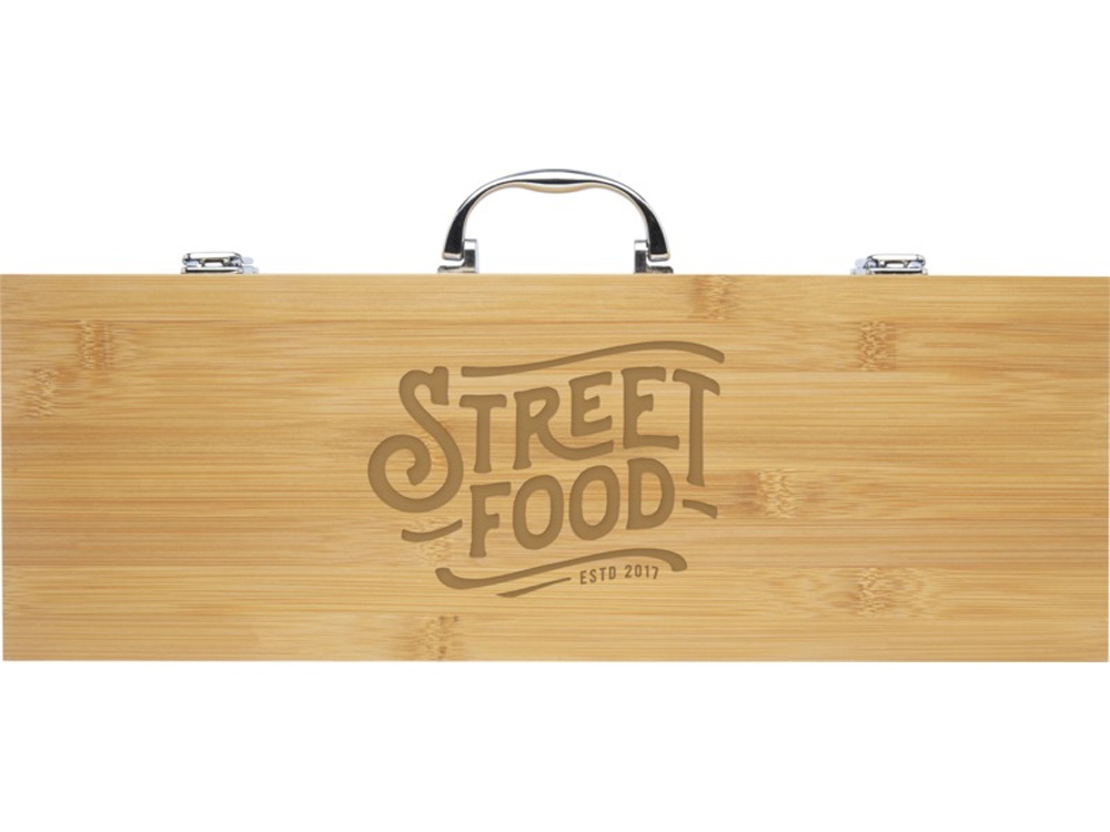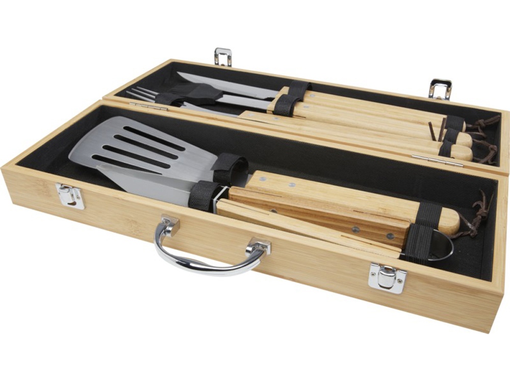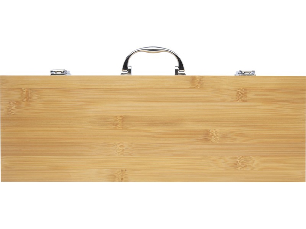 Набор для барбекю из 5 предметов из бамбука: лопатка (40 x 9,5 см), щипцы (34,5 x 6 см), вилка (38,5 x 3 см), нож (38,5 x 3 см) и щетка (38 x 4,3 см). Набор поставляется в подарочной коробке из бамбука (46 x 16,2 x 7,4 см). Ручки и подарочная коробка изготовлены из бамбука, который производится в соответствии со стандартами устойчивого развития. -
