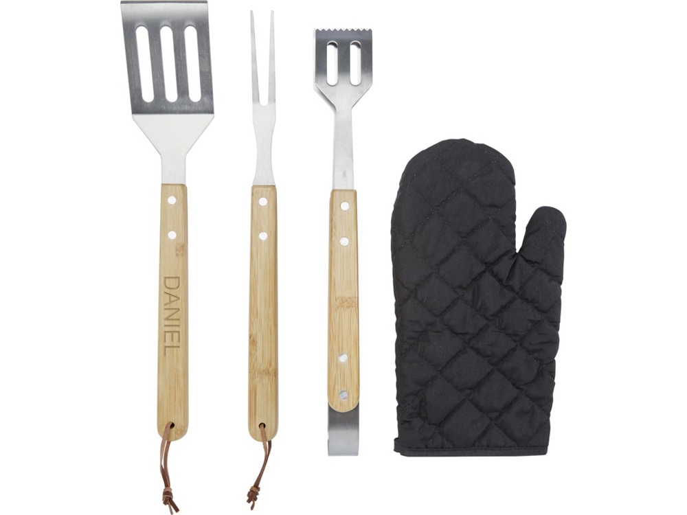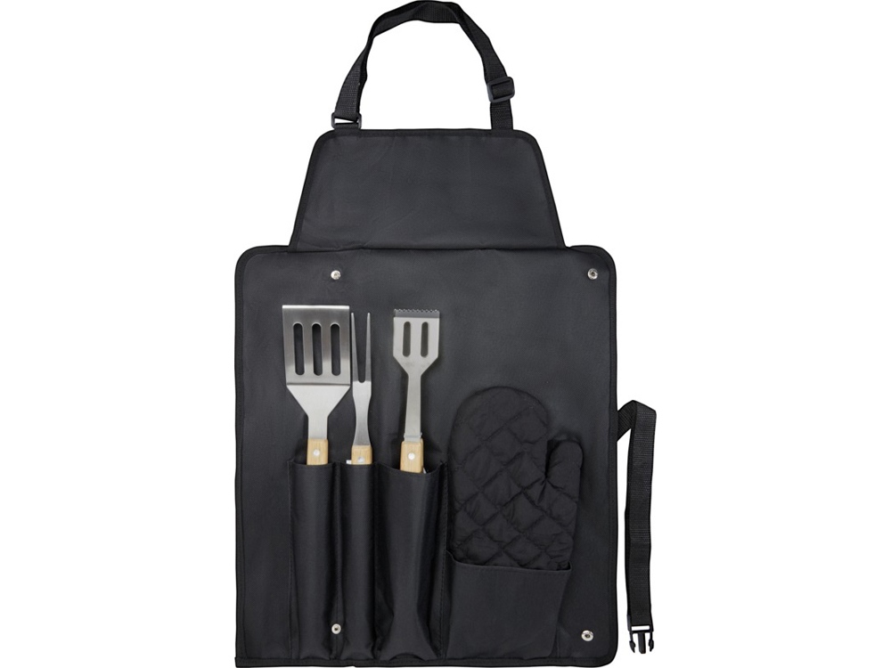 Набор для барбекю из 5 предметов: лопатка (36,5 x 7 см), вилка (36,5 x 2 см), щипцы (36,5 x 5 см), перчатка (25 x 16 см) и фартук с сумкой (42 x 60 см). Ручки сделаны из бамбука, который добывается и производится в соответствии со стандартами устойчивого развития. -
