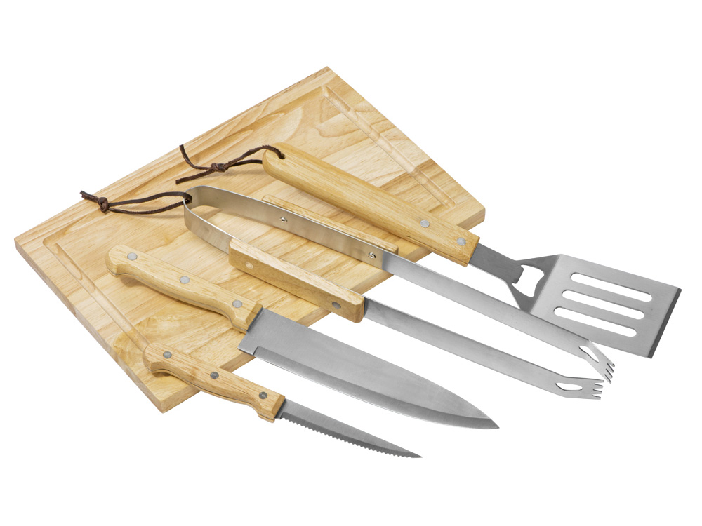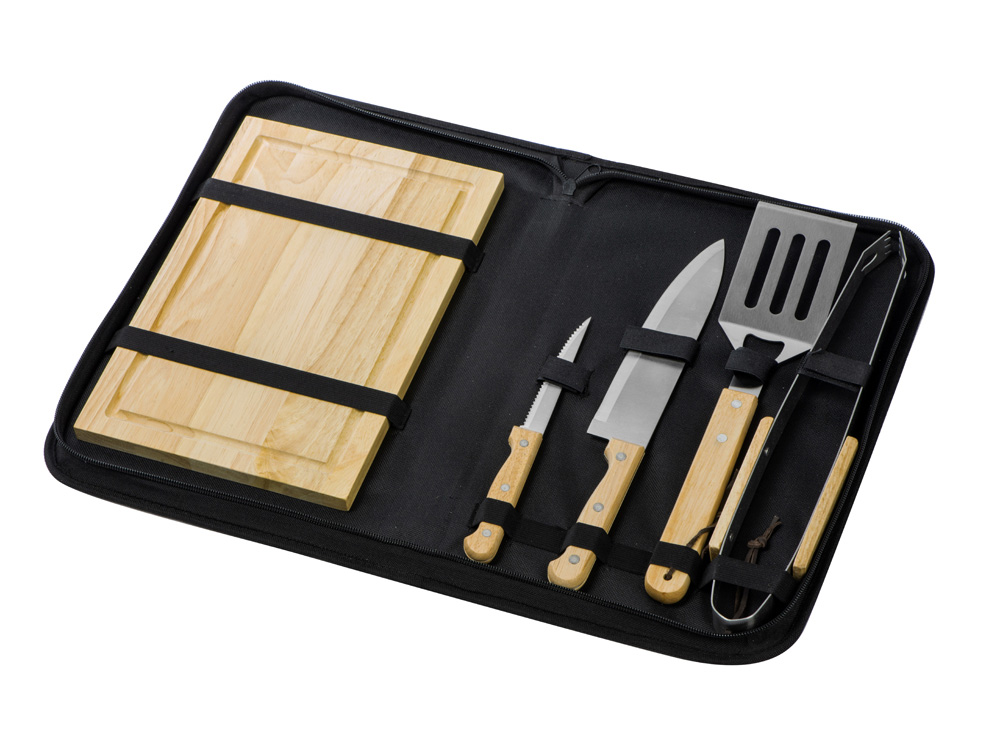 Набор из шести приспособлений для барбекю и гриля - в состав входят разделочная доска, щипцы, лопатка, нож для стейка, нож большой, а упаковывается сет в чехол из полиэстера.