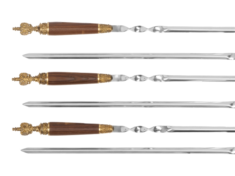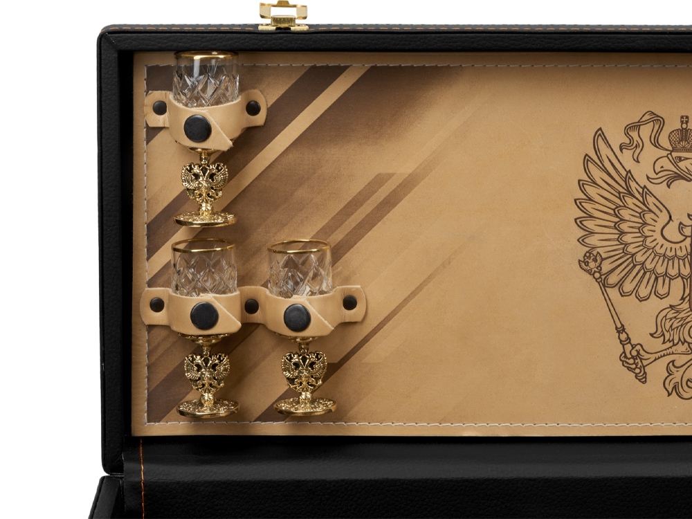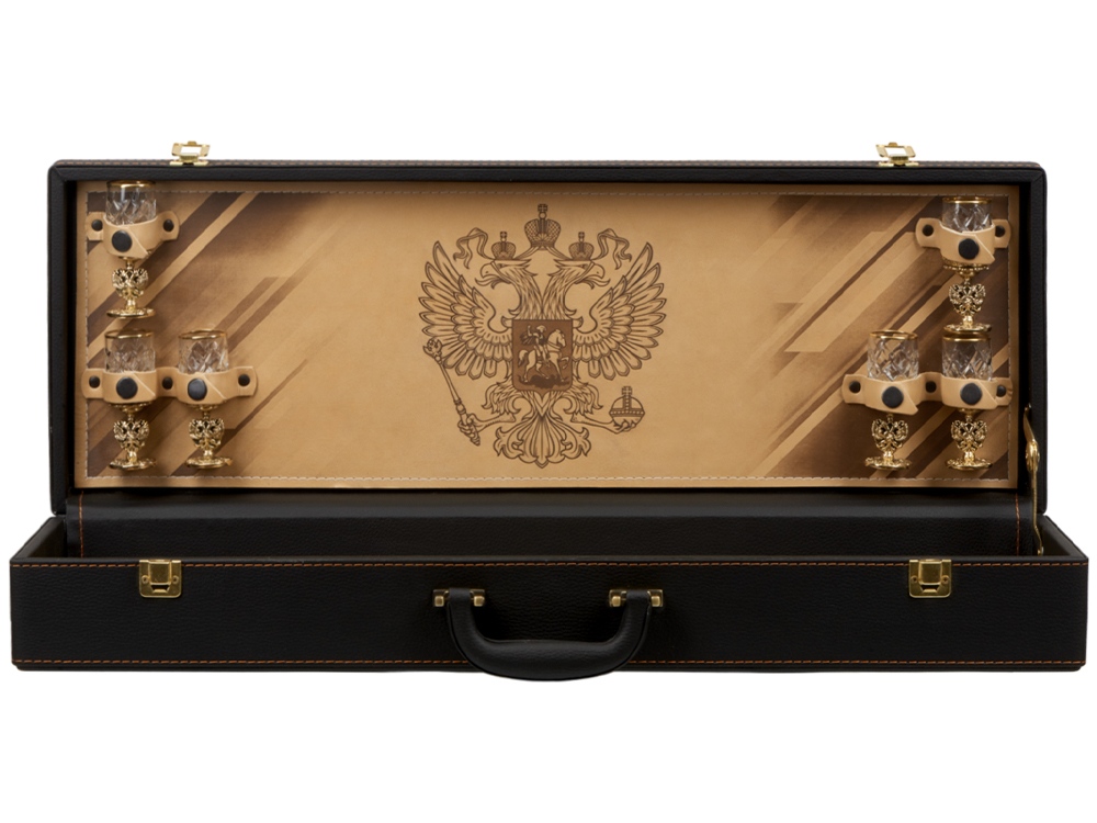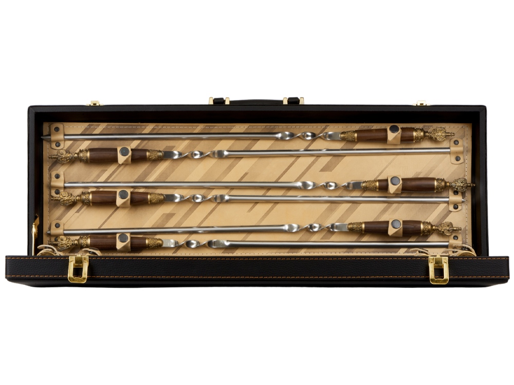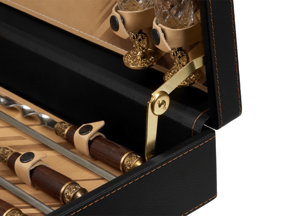 стопки- хрусталь/литье, шампура- нержавеющая столь/дерево, дипломат- сплит кожа