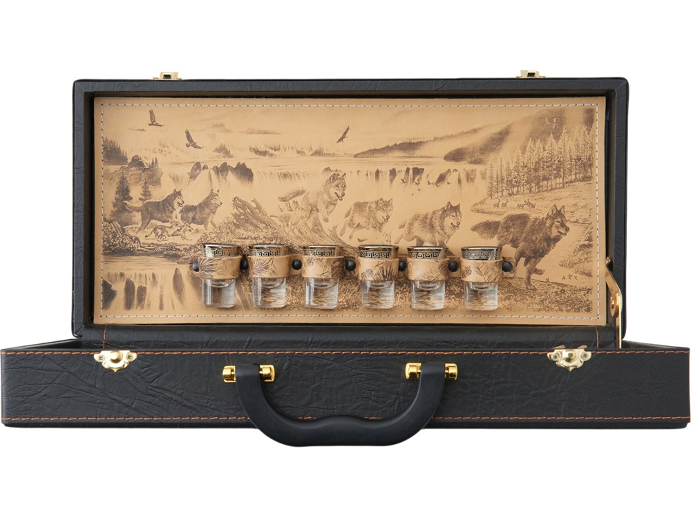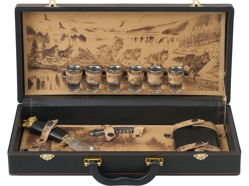 Все аксессуары упакованы в кейс из сплит-кожи, внутренняя отделка натуральная кожа с художественным выжиганием. Каждое изделие уникально, так как художественное выжигание может отличаться от представленного на фото, что придаёт набору особую индивидуальность. Все аксессуары надежно крепятся к кейсу кожаными ремешками на кнопке, обеспечивая удобство транспортировки и сохранность содержимого.