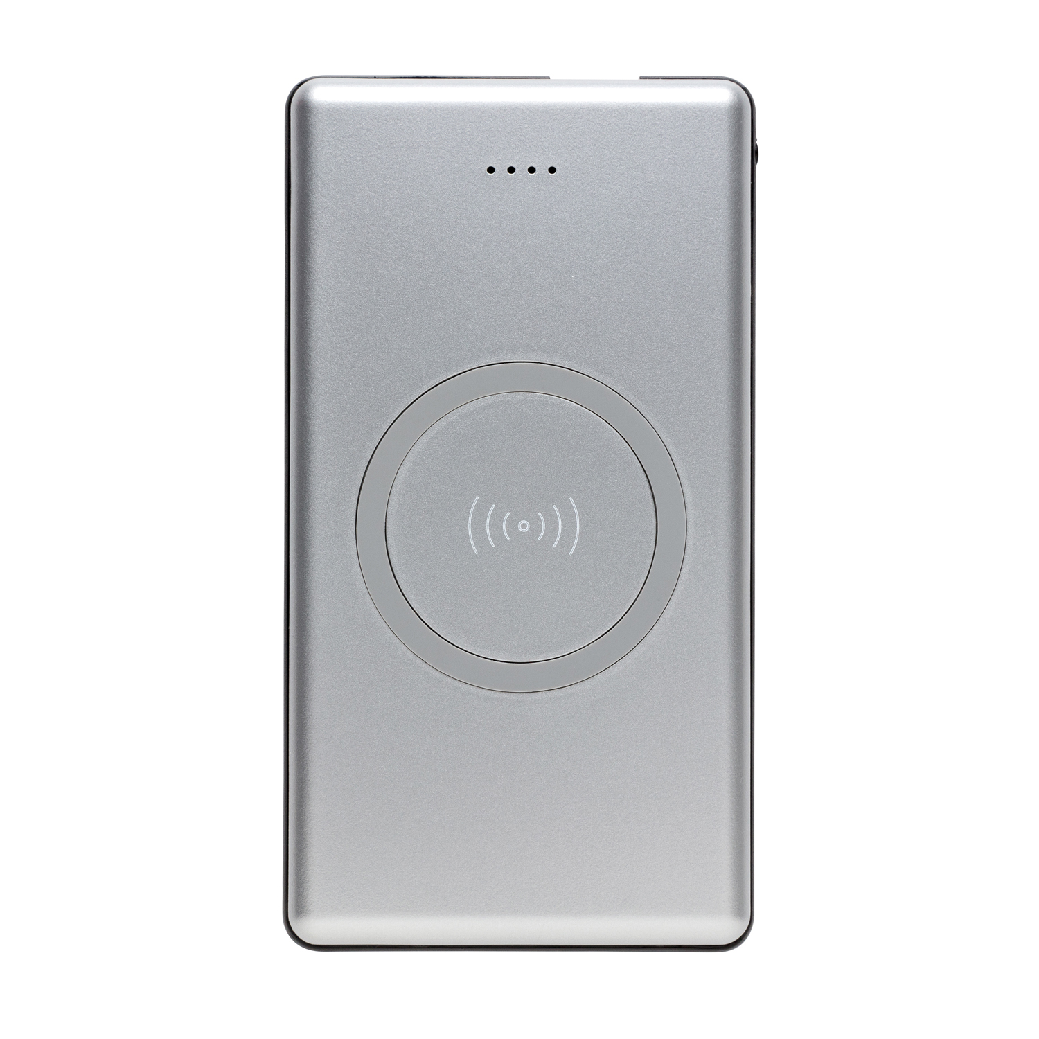Беспроводной внешний аккумулятор емкостью 4 000 мАч с литиевой батареей высокого качества. Кнопка включения / выключения и индикатор оставшегося заряда. Аккумулятор имеет встроенную функцию беспроводной зарядки 5W для заряда вашего мобильного телефона без использования кабеля. Совместим со всеми устройствами, поддерживающими технологию QI, такими как Android последнего поколения, iPhone 8, 8S и X. Выход USB: 5V / 2.1A. Вход: 5V / 1.5A. Беспроводной выход: 5V / 1A 5W. В комплекте кабель micro USB.