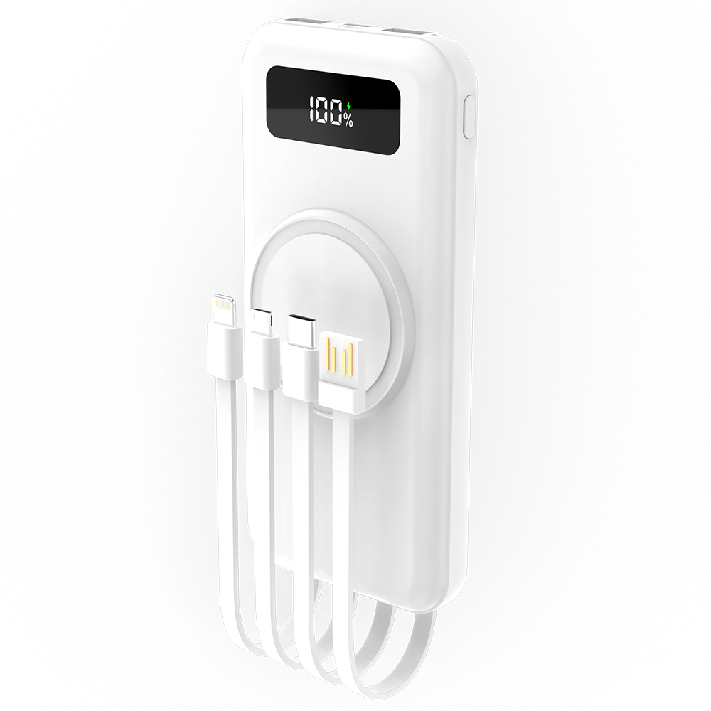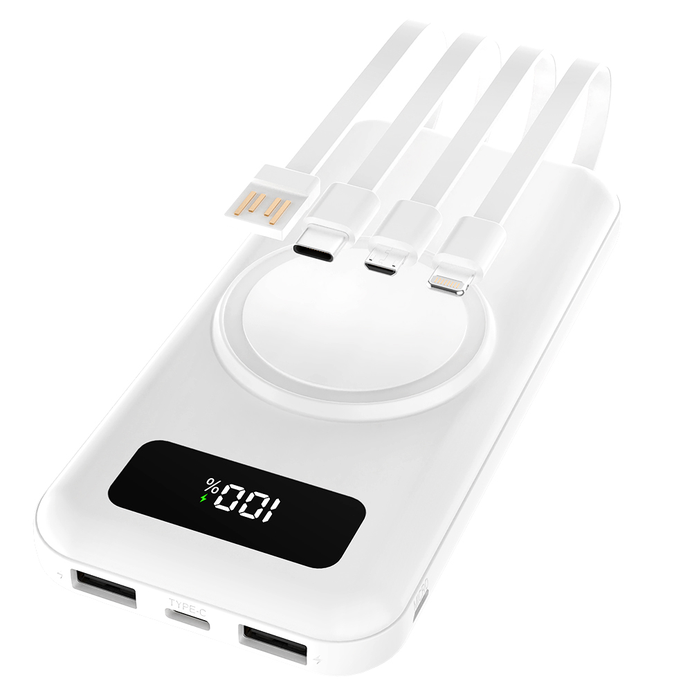 Один из самых продвинутых и практичных внешних аккумуляторов емкостью 10 000 мАч — это идеальное сочетание технологий, надежности и современного дизайна. Его стильный корпус гармонично объединяет весь функционал, необходимый активным пользователям, ценящим мобильность и комфорт. На передней панели расположен яркий индикатор заряда, позволяющий в любой момент контролировать уровень энергии. Встроенная беспроводная зарядка мощностью 5W делает зарядку ваших устройств по-настоящему удобной — просто положите смартфон или другую тоже поддерживающую функцию, и он начнет заряжаться без лишних проводов. Инновационный дизайн корпуса включает встроенные кабели питания — Micro-USB, Lightning и Type-C (5V/2A), что избавляет вас от необходимости носить с собой лишние кабели и обеспечивает максимально быстрое подключение. Усиленная батарея, рассчитанная на более чем 500 циклов зарядки и разрядки, гарантирует долгий срок службы и стабильную работу устройства. Этот аккумулятор — надежный спутник для путешествий, деловых поездок и ежедневных приключений, объединяющий современные технологии и высочайшее качество в одном стильном корпусе.- Цвет: Белый