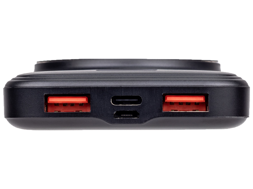 Аккумулятор оснащен несколькими выходными разъемами, включая два USB-A и один QI. USB-A разъемы поддерживают выходное напряжение 5-12 В и мощность до 22.5 Вт каждый, что позволяет заряжать различные устройства, включая смартфоны, планшеты, наушники и другие гаджеты. QI разъем поддерживает выходное напряжение 5-12 В и мощность до 15 Вт, что обеспечивает беспроводную зарядку для совместимых устройств.