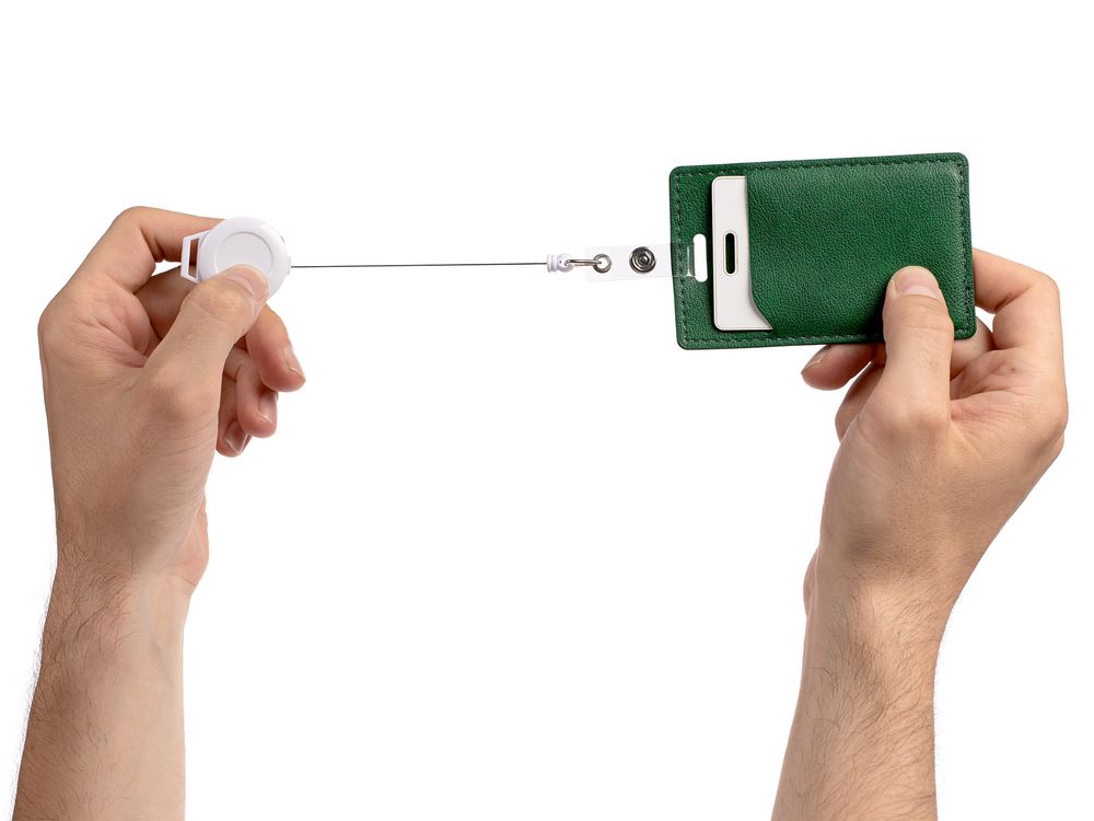 На ретрактор можно поместить бейдж, визитку или магнитную карту. В корпусе спрятан сворачивающийся шнур, который позволяет при необходимости демонстрировать содержимое держателя, не снимая его.