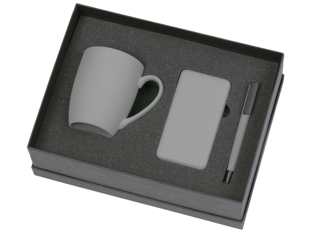 кружка - фарфор с покрытием soft-touch, повербанк - пластик с покрытием soft-touch, ручка - пластик с покрытием soft-touch.