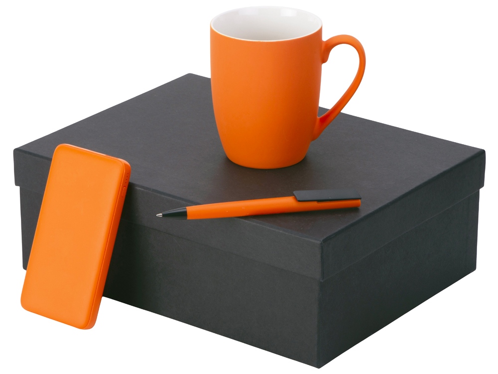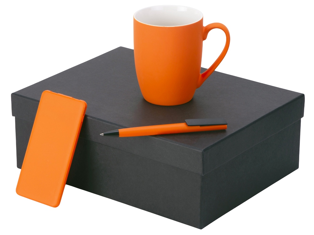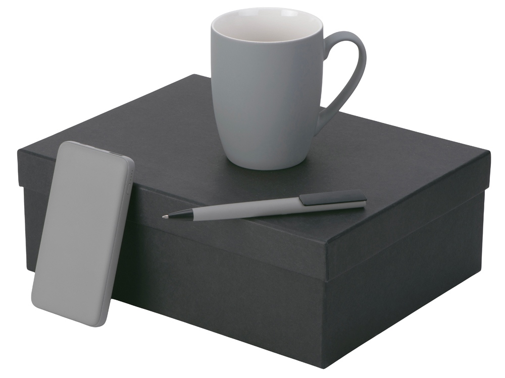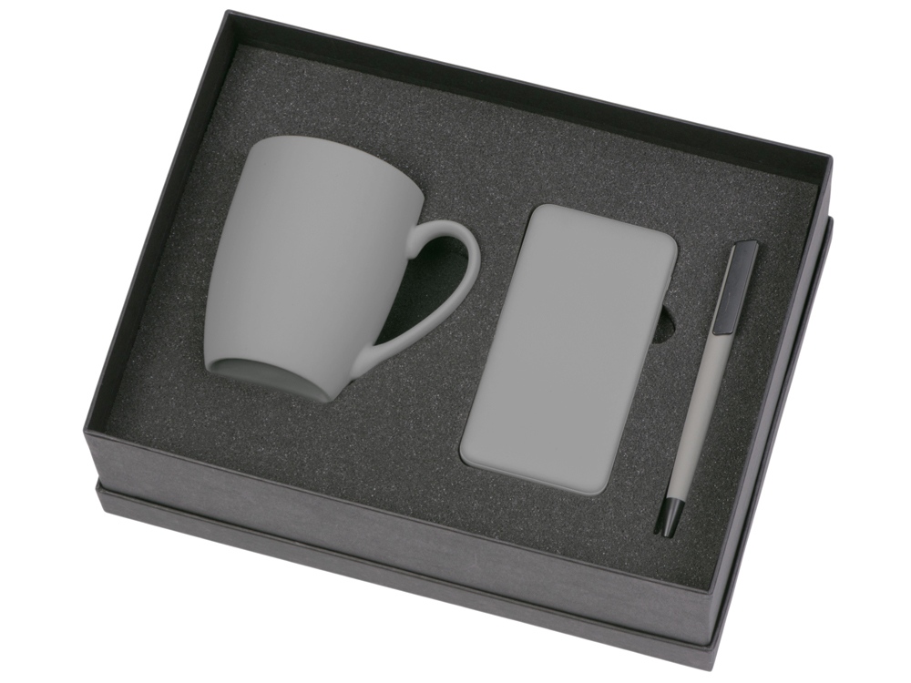 кружка - фарфор с покрытием soft-touch, повербанк - пластик с покрытием soft-touch, ручка - пластик с покрытием soft-touch.