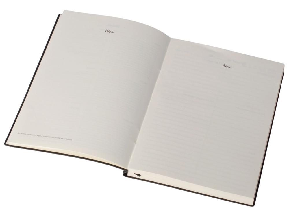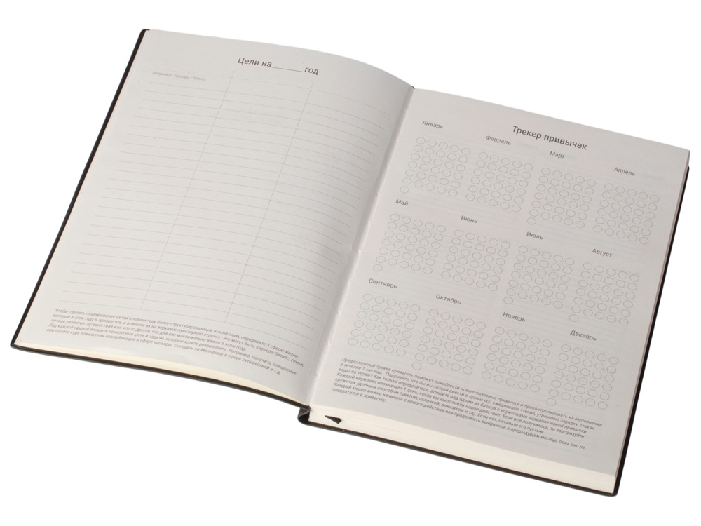 Бумажный блок выполнен из бумаги, полученной из древесины из специальных восполняемых лесных ресурсов, имеет сертификат FSC, международной некоммерческой организации лесного попечительского совета. Линовка — недатированный ежедневник, а на первых страницах вы встретите специальные листы для постановки целей на год и подведения итогов, а также другие трекеры.