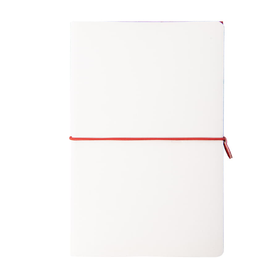 COMBI – Размер блокнота 130*210 мм- два направления открытия блокнота: с лицевой стороны – традиционное горизонтальное раскрытие, с оборотной стороны – вертикальное раскрытие, а-ля блокнот «reporter».- два разных материала обложки: с лицевой стороны – имитирующий настоящую кожу PU Shevret (цвет - белый),с оборотной стороны - яркий PU Silk Plus (цвет, близкий к pantone 200C).                                                                                - два разных внутренних блока по 96 страниц соединены под  одной обложкой:первый блок - в клетку, второй – нелинованный c перфорацией.Гибкий переплет. Горизонтальная резинка с PU клипом с функцией пенхолдераИдеально скругленные углы блока. Кремовая  eco-friendly эвкалиптовая FSC бумага 70 г м2.