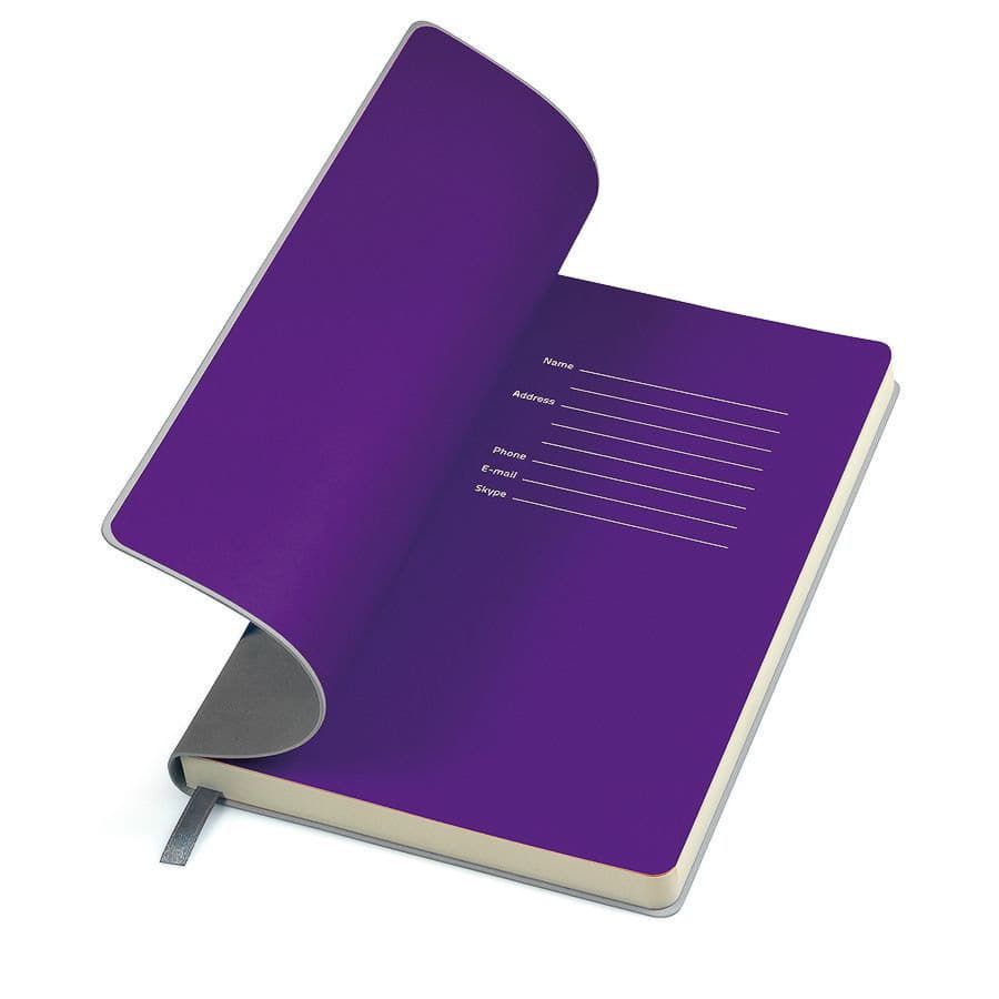 Блокнот с мягкой термоактивной обложкой и популярной комбинацией цветов Термоактивный PU материал Velvet Цвет обложки, близкий к Pantone 423C Цвет форзаца, близкий к Pantone Violet 2613U Внутренний блок 256 страниц в линейку Идеально скругленные углы блока Перфорированные 8 последних листов Кремовая FSC бумага 70 г м2 Ляссе в тон обложки Индивидуальная упаковка: фирменный сливбокс thINKme -
