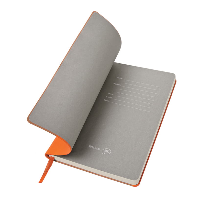Блокнот с мягкой термоактивной обложкой и популярной комбинацией цветов Термоактивный PU материал Velvet Цвет обложки, близкий к Pantone 158C Цвет форзаца, близкий к Pantone Cool Gray 5U Внутренний блок 256 страниц в линейку Идеально скругленные углы блока Перфорированные 8 последних листов Кремовая FSC бумага 70 г м2 Ляссе в тон обложки Индивидуальная упаковка: фирменный сливбокс thINKme -