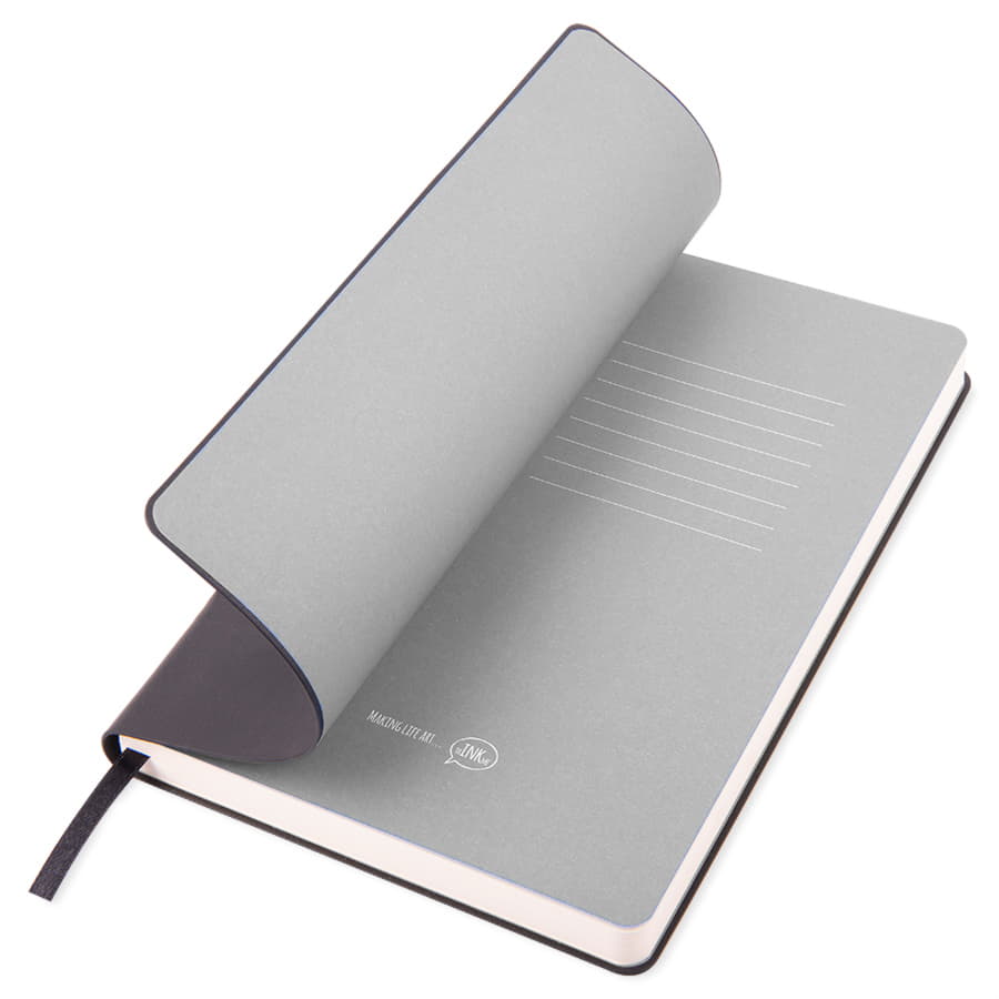 Блокнот с мягкой термоактивной обложкой и популярной комбинацией цветов Термоактивный PU материал Velvet Цвет обложки, близкий к Pantone Black Цвет форзаца, близкий к Pantone Cool Gray 5U Внутренний блок 256 страниц в линейку Идеально скругленные углы блока Перфорированные 8 последних листов Кремовая FSC бумага 70 г м2 Ляссе в тон обложки Индивидуальная упаковка: фирменный сливбокс thINKme -