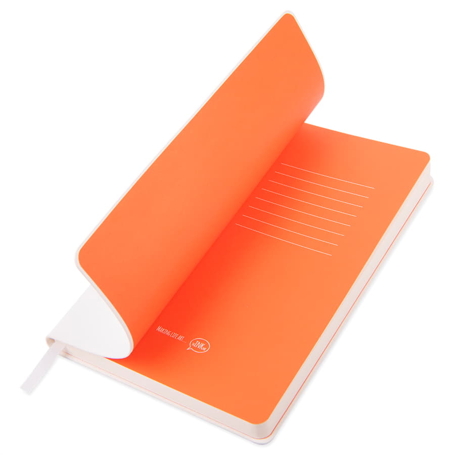 Блокнот с мягкой термоактивной обложкой и популярной комбинацией цветовТермоактивный PU материал VelvetЦвет обложки белыйЦвет форзаца, близкий к Pantone 021UВнутренний блок 256 страниц в точкуИдеально скругленные углы блокаПерфорированные 8 последних листов Кремовая FSC бумага 70 г м2Ляссе в тон обложкиИндивидуальная упаковка: фирменный сливбокс thINKme -