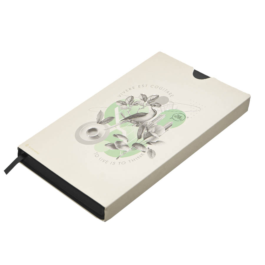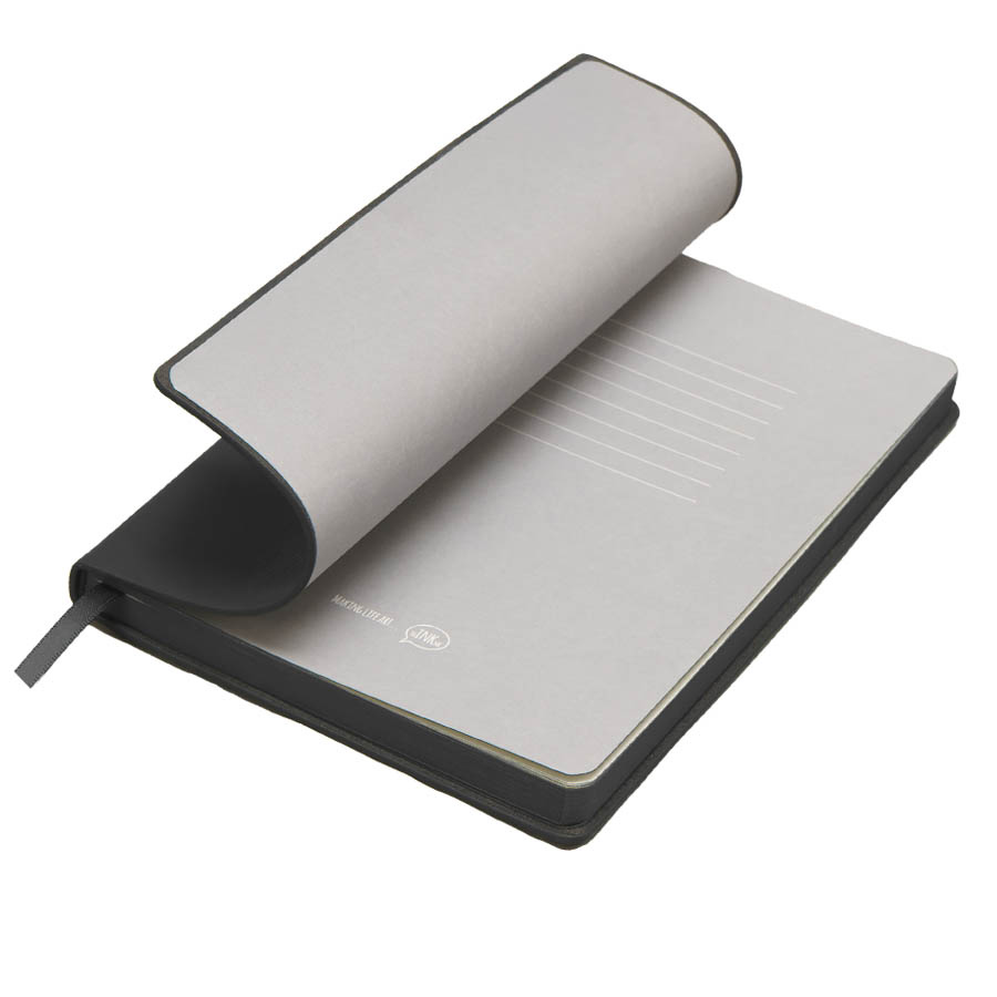 Бизнес-блокнот LADYЦвет обложки черный, близкий к Pantone 426CРазмер 150*210 мм, переплет мягкийОбложка - не термоактивный PU с эффектом кожи наппаБлок в клетку, скругленные углыСрез в цвет обложкиБумага кремовая, плотность 70 г м2Форзац нахцаз серый, близкий к Pantone 5 U Cool grey256 стр, перфорация на последних страницахЛяссе, 7 мм, в цвет обложкиУпаковка сливбокс + бумага -