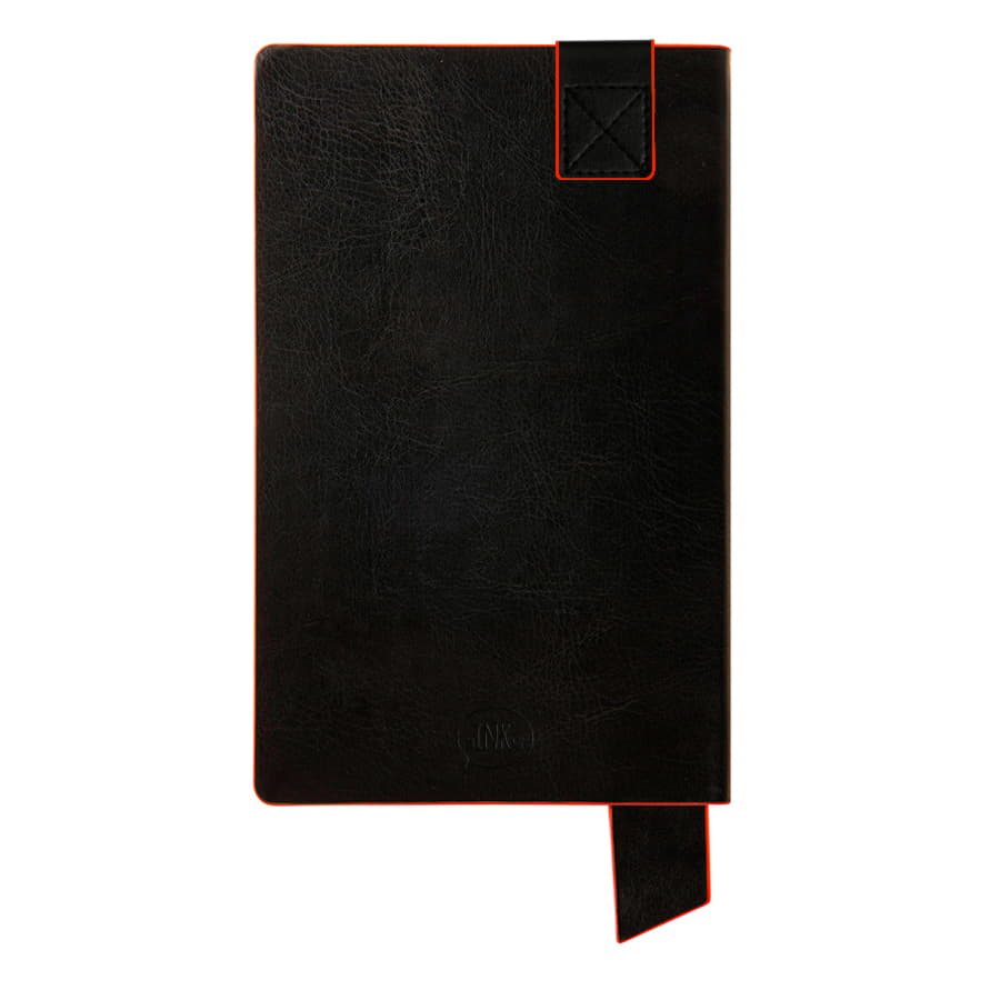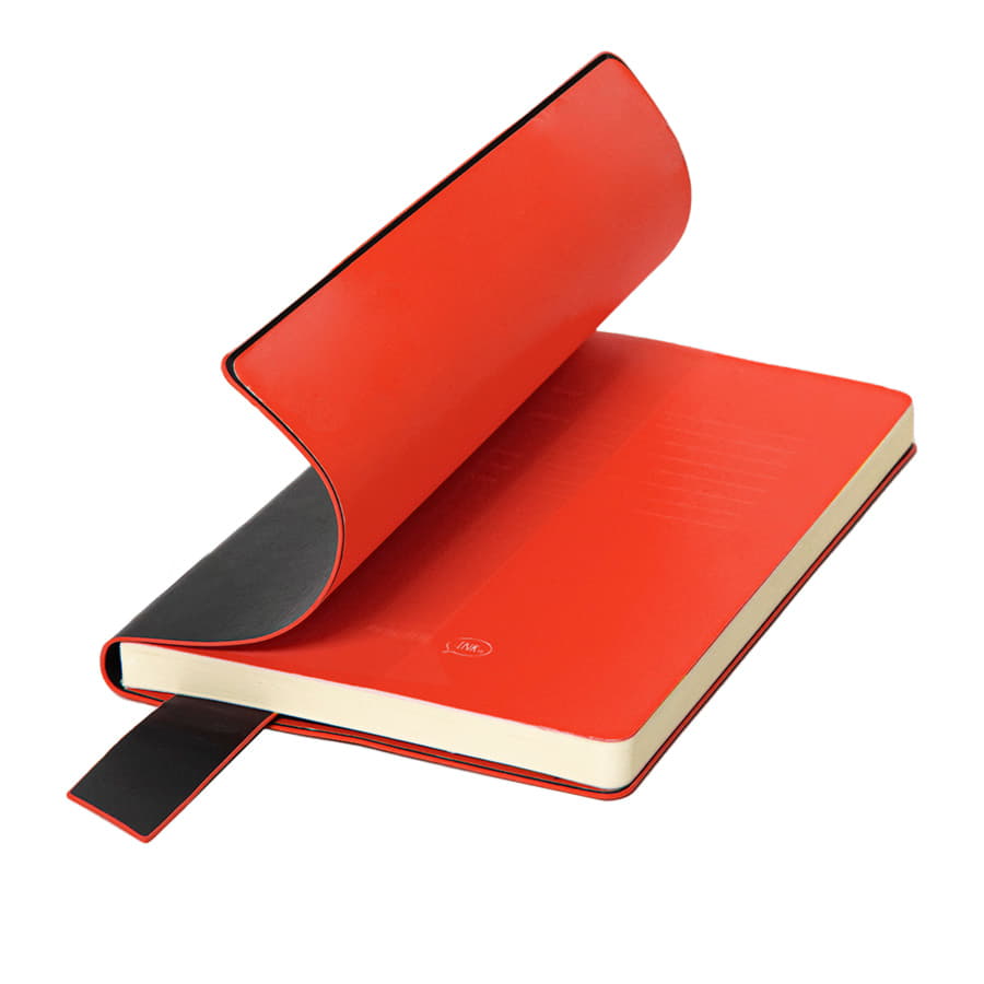 Размер блокнота 130*210 мм. Имитирующая натуральную кожу мягкая PU обложка Bondy черного цвета по краям имеет яркую цветовую отделку. Широкая закладка из аналогичного PU также контрастно окрашена по краям. Форзац и нахзац в тон цветному канту обложки. Цвет форзаца нахзаца и отделки обложки близок к pantone 2035C. Внутренний блок 256 страниц в линейку. Идеально скругленные углы блока. Перфорированные 8 последних листов. Кремовая eco-friendly FSC бумага 70 г м2. Карман для записок в тон нахзаца. -