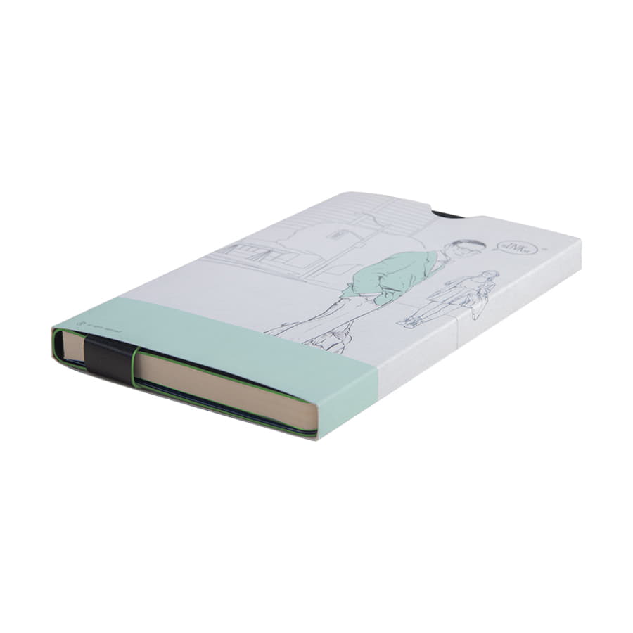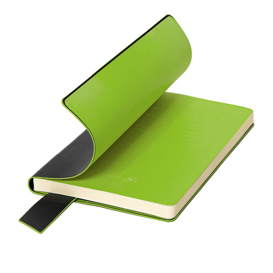 Размер блокнота 130*210 мм. Имитирующая натуральную кожу мягкая PU обложка Bondy черного цвета по краям имеет яркую цветовую отделку. Широкая закладка из аналогичного PU также контрастно окрашена по краям. lt; Форзац и нахзац в тон цветному канту обложки. Цвет форзаца нахзаца и отделки обложки близок к pantone 2294C. Внутренний блок 256 страниц в линейку. Идеально скругленные углы блока. Перфорированные 8 последних листов. Кремовая eco-friendly FSC бумага 70 г м2. Карман для записок в тон нахзаца. -