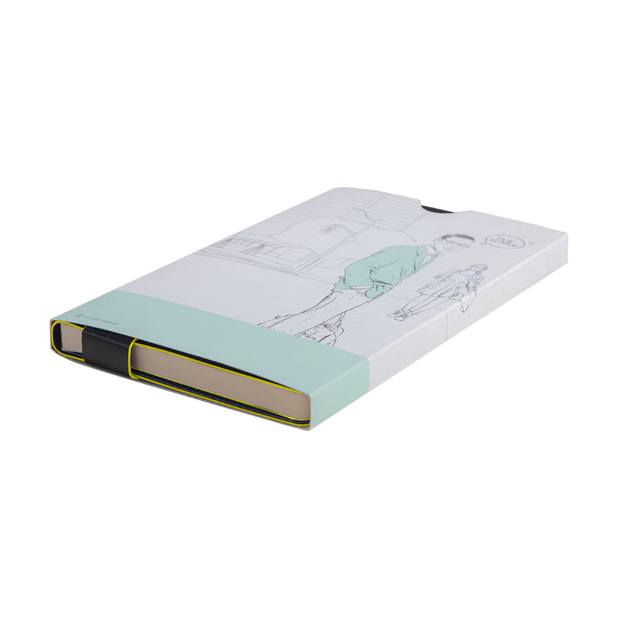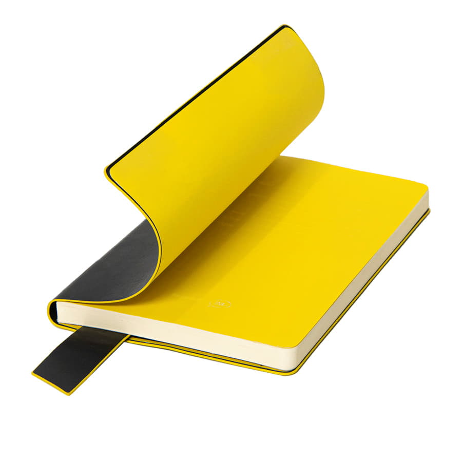 Размер блокнота 130*210 мм.  Имитирующая натуральную кожу мягкая PU обложка Bondy черного цвета по краям имеет яркую цветовую отделку.  Широкая закладка из аналогичного PU также контрастно окрашена по краям.  Форзац и нахзац в тон цветному канту обложки.  Цвет форзаца нахзаца и отделки обложки близок к pantone YellowU.  Внутренний блок 256 страниц в линейку.  Идеально скругленные углы блока.  Перфорированные 8 последних листов.  Кремовая eco-friendly FSC бумага 70 г м2.  Карман для записок в тон нахзаца.
