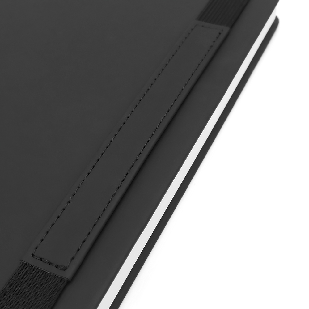 Блокнот формата А5 в твёрдой обложке из искусственной кожи. Материал обложки — термополиуретан, текстура — гладкая. Из особенностей: широкая эластичная застёжка со вставкой из кожзама. На неё можно нанести логотип либо слоган вашей компании. Размеры: 214*138*17 мм, 192 страницы / 96 листов, страницы разлинееные, бумага плотностью 80 г/м2. Размер вставки из кожзама 134*17 мм; ширина застёжки — 15 мм.- Виды нанесений: УФ-печать А2, Гравировка CO2-А2, Тиснение, УФ-Лак, УФ-Цвет+Лак, Тиснение фольгой