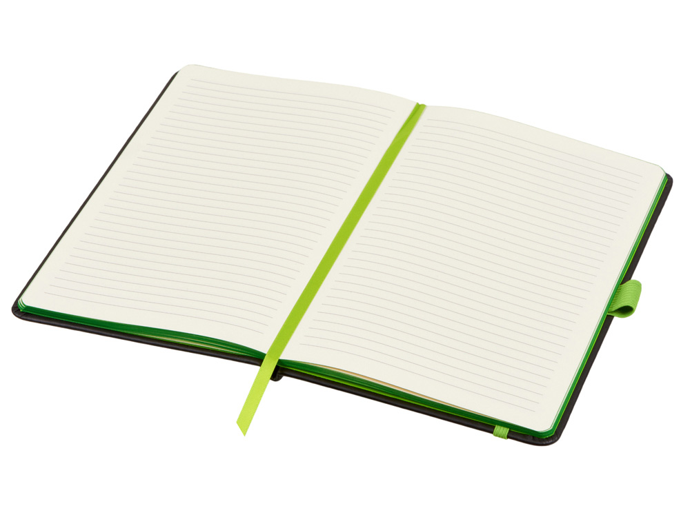 Блокнот в твердой обложке с закругленными углами черного цвета. Ляссе, резинка и срез яркого контрастного цвета делают его очень стильным и функциональным бизнес-аксессуаром.