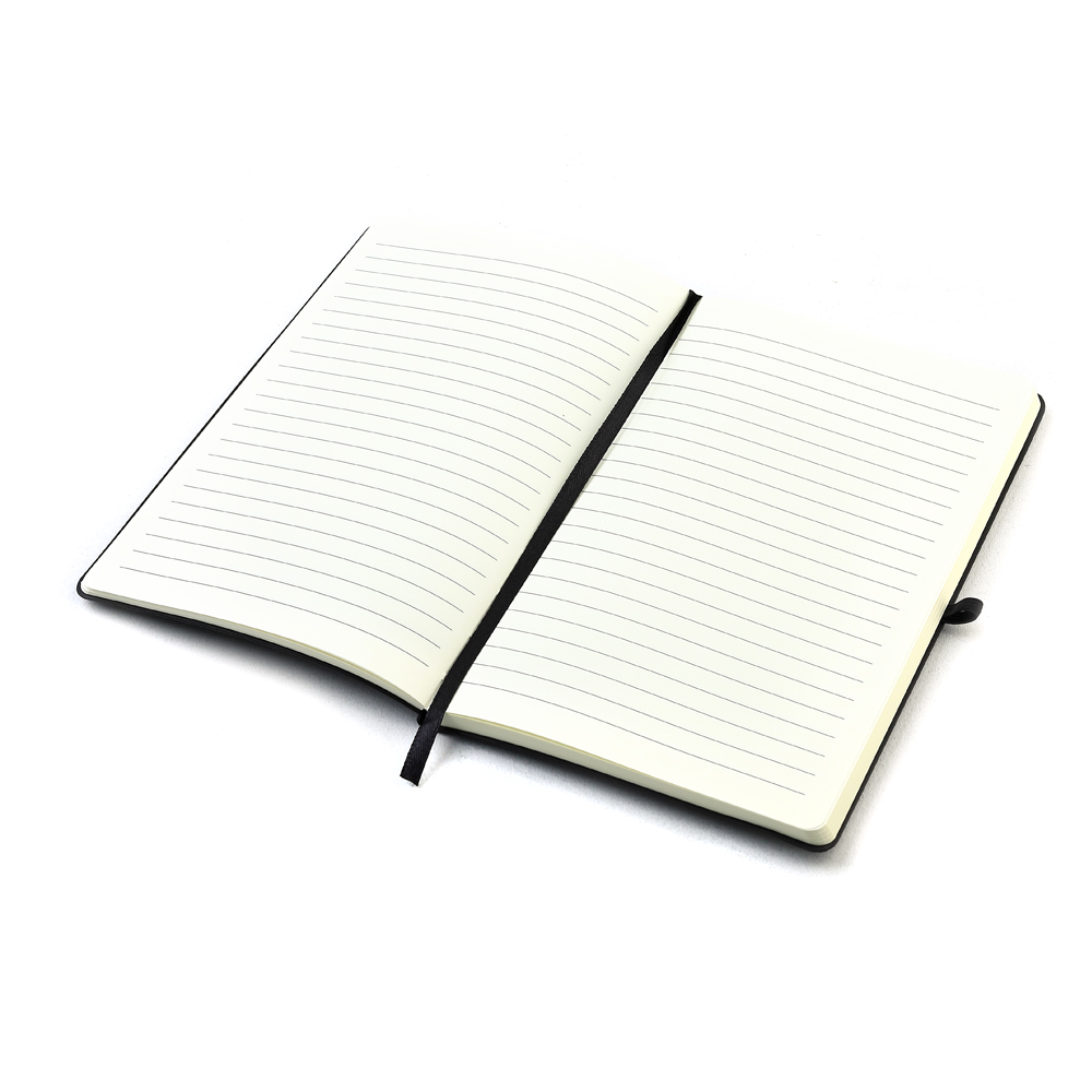 Блокнот формата А5 с мягким покрытием из PU-материала с имитацией рисунка кожи, с эластичной застежкой и текстильной закладкой, наличие петли для ручки в цвет блокнота, 192 страницы, плотность 70г/м, страницы с черными линиями.- Виды нанесений: Тиснение, УФ-печать А2, Гравировка CO2-А2, Тиснение фольгой, УФ-Лак, УФ-Цвет+Лак