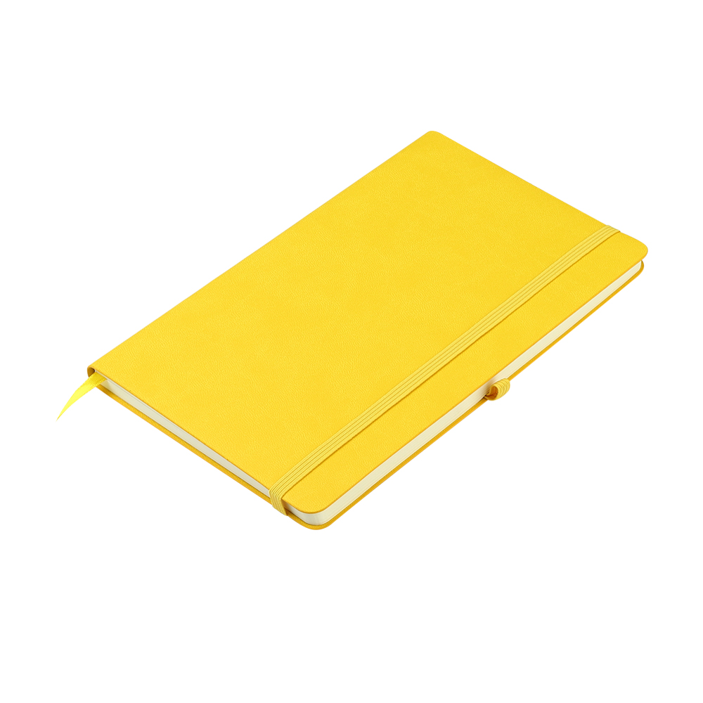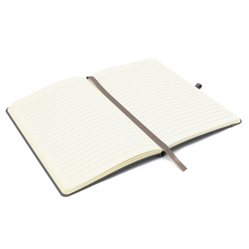 Блокнот формата А5 с мягким покрытием из PU-материала с имитацией рисунка кожи, с эластичной застежкой и текстильной закладкой, наличие петли для ручки в цвет блокнота, 192 страницы, плотность 70г/м, страницы с черными линиями. Цвет по PANTONE® (максимально приближен): Cool Gray 10 C.- Виды нанесений: Тиснение, УФ-печать А2, Гравировка CO2-А2, Тиснение фольгой, УФ-Лак, УФ-Цвет+Лак