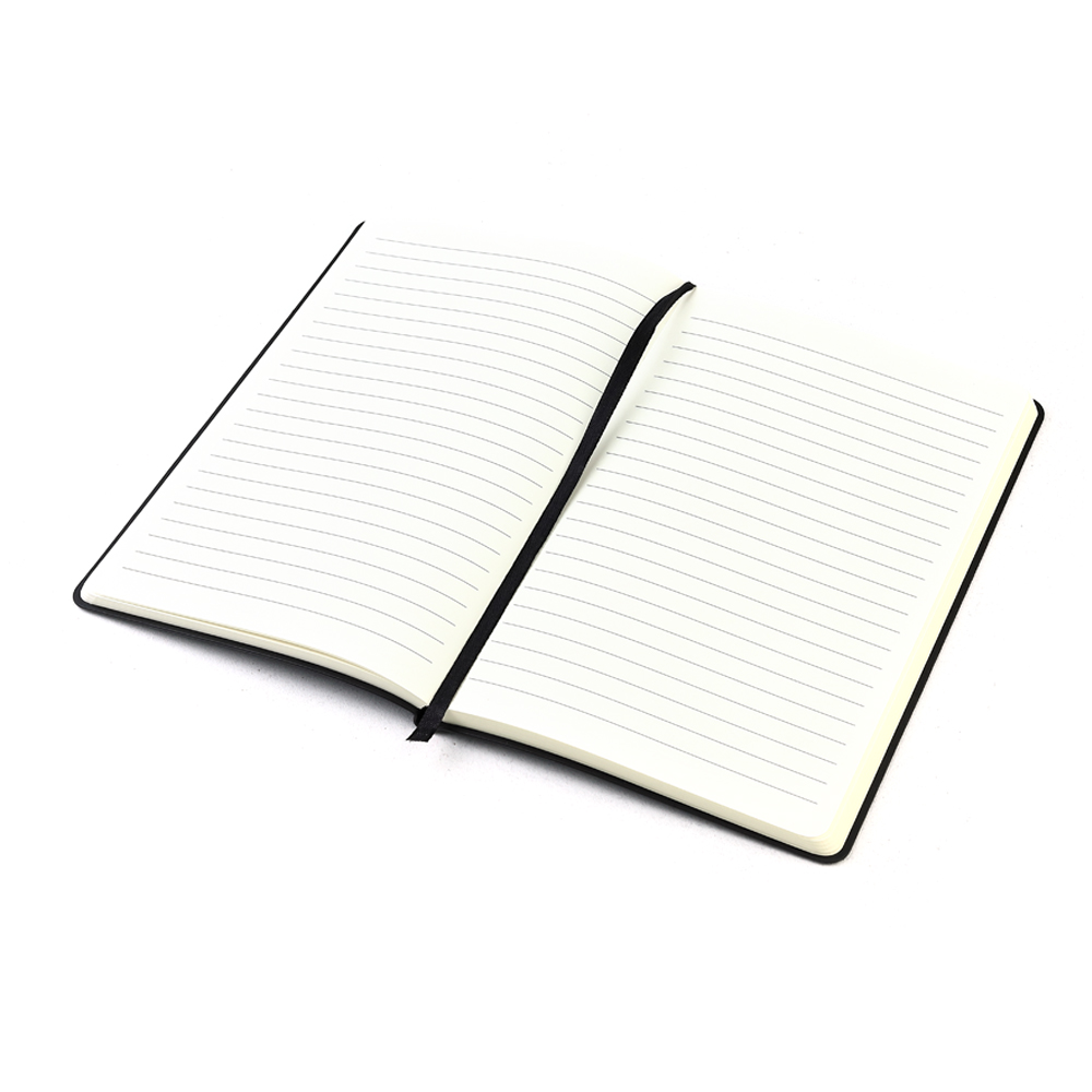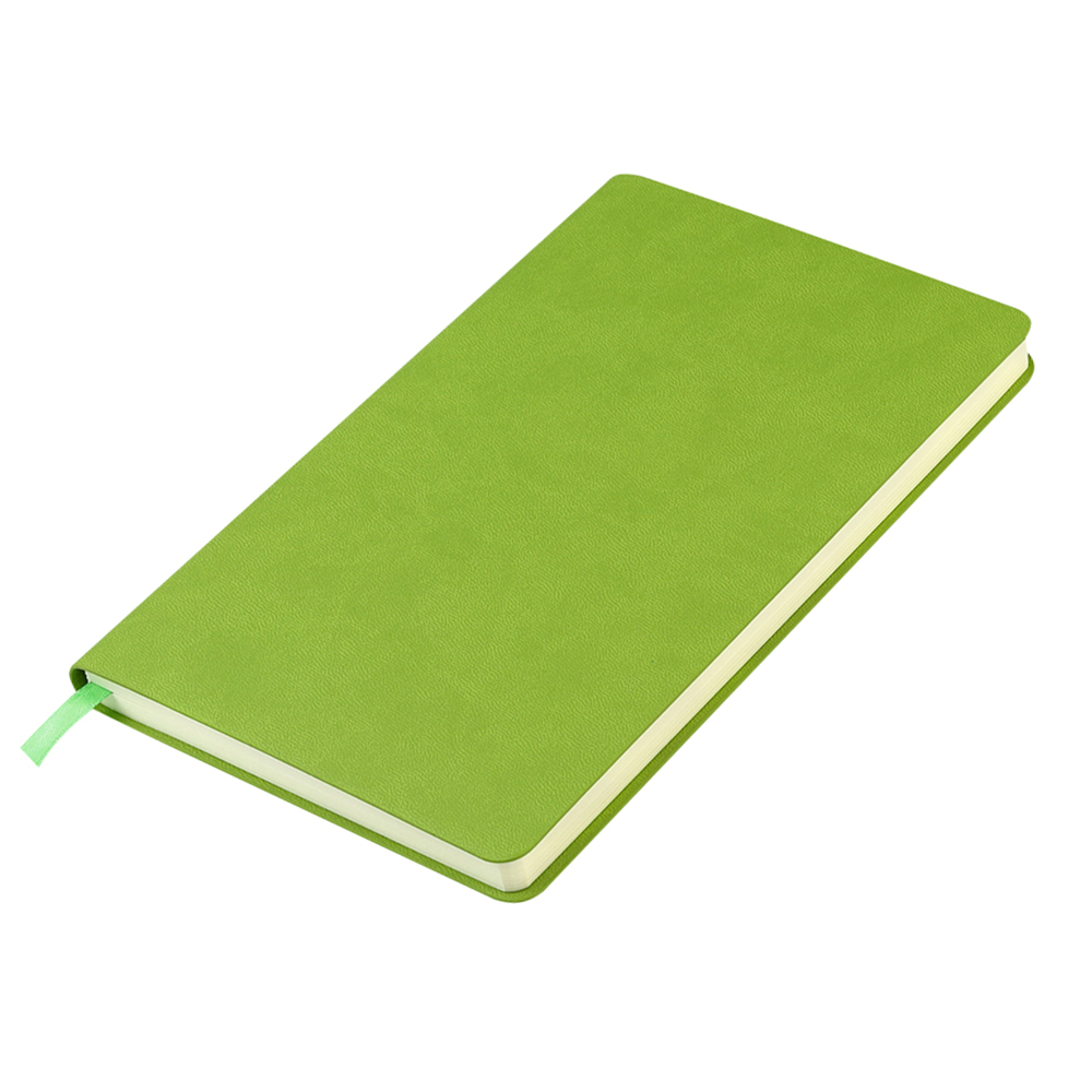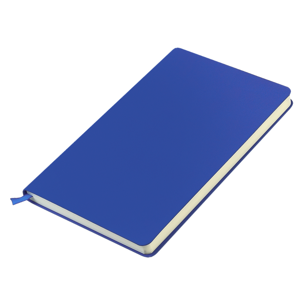 Блокнот формата А5 с мягкой обложкой из PU-материала, имеющего текстуру, имитирующую поверхность натуральной кожи; с текстильной закладкой в цвет блокнота, 256 страниц, плотность 70г/м, страницы с черными линиями.- Виды нанесений: УФ-печать А2, Тиснение, Гравировка CO2-А2, Тиснение фольгой, УФ-Лак, УФ-Цвет+Лак