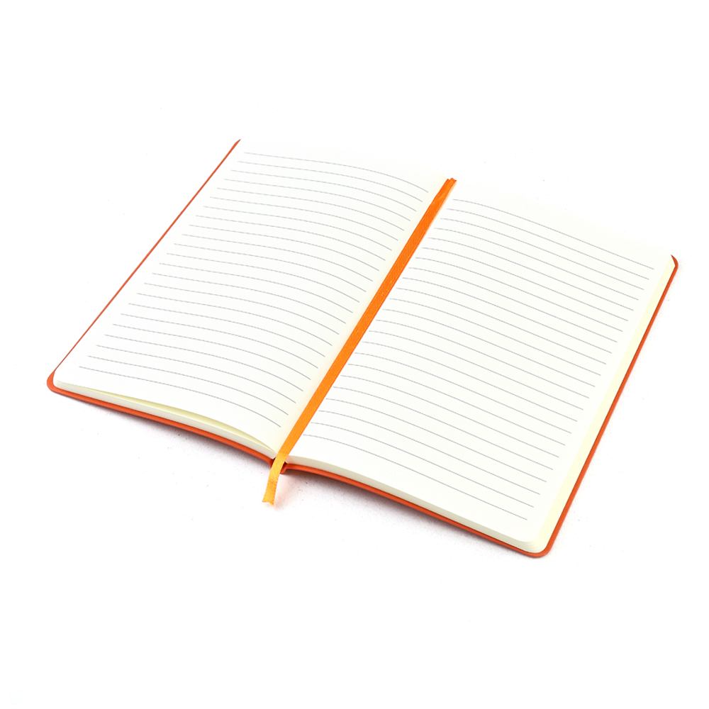 Блокнот формата А5 с мягкой обложкой из PU-материала, имеющего текстуру, имитирующую поверхность натуральной кожи; с текстильной закладкой в цвет блокнота, 256 страниц, плотность 70г/м, страницы с черными линиями. Цвет по PANTONE® (максимально приближен): 166C.- Виды нанесений: УФ-печать А2, Тиснение, Гравировка CO2-А2, Тиснение фольгой, УФ-Лак, УФ-Цвет+Лак