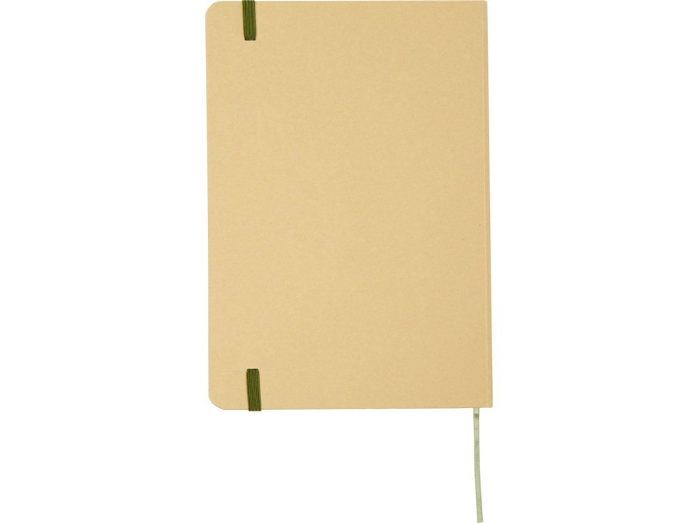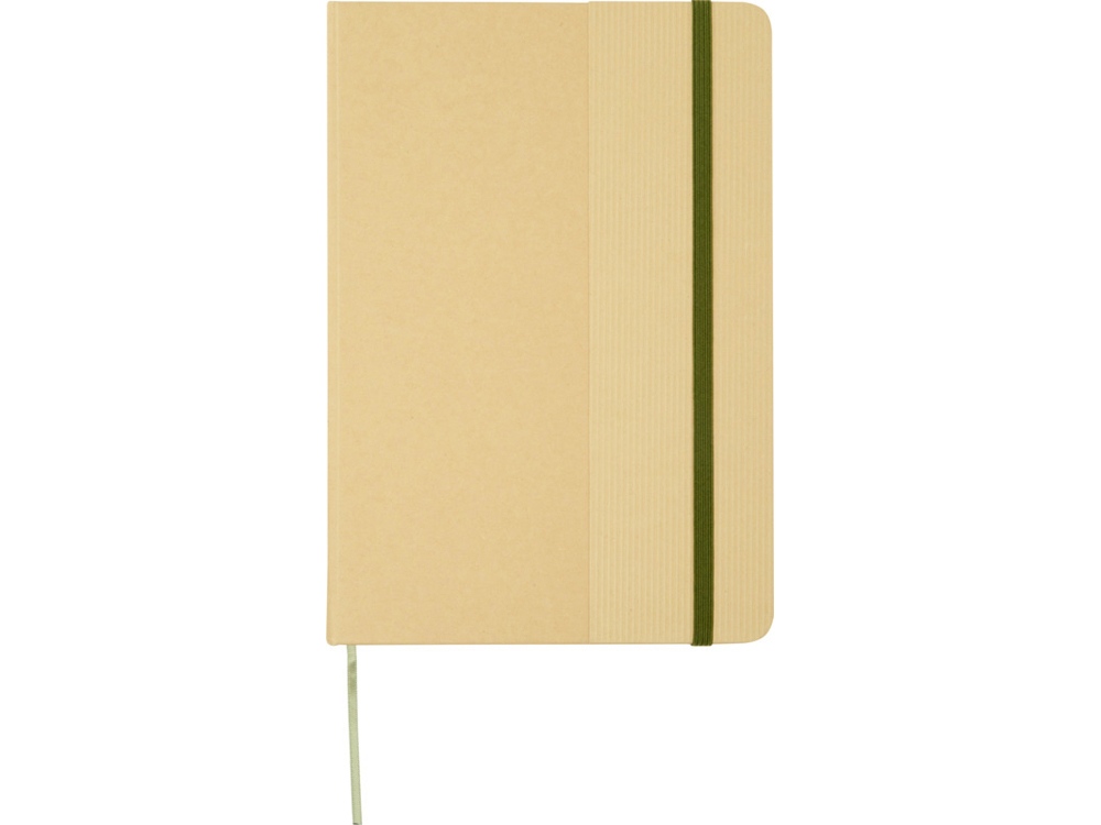 Блокнот формата А5 в твердой обложке из переработанного картона, 80 листов бумаги плотностью 70 г/м² в линейку. Блокнот имеет эластичную застежку, ленту и закругленные углы. FSC certified paper. FSC Mix 100% P7.1 CU-COC-877277.