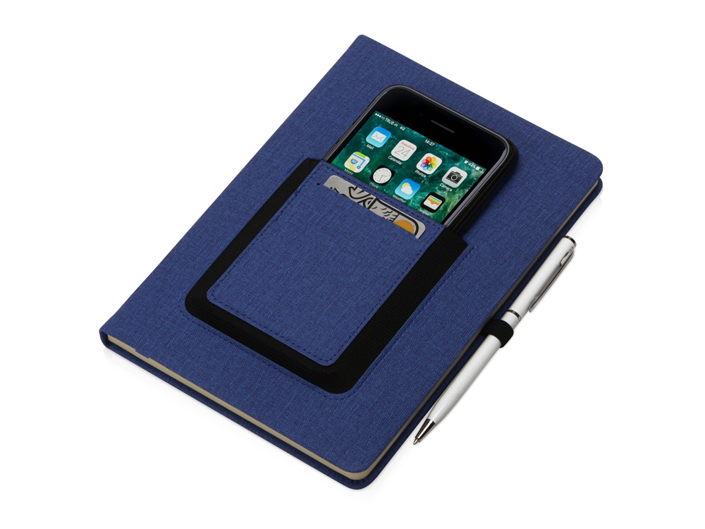 Стильный современный блокнот формата А5. На передней обложке расположен удобный карман для мобильного телефона, бумаг и визиток. Специальная подкладка обложки делает блокнот мягким на ощупь. Покрытие обложки имитирует текстуру текстиля, не скользит и отлично подходит для нанесения логотипа. -