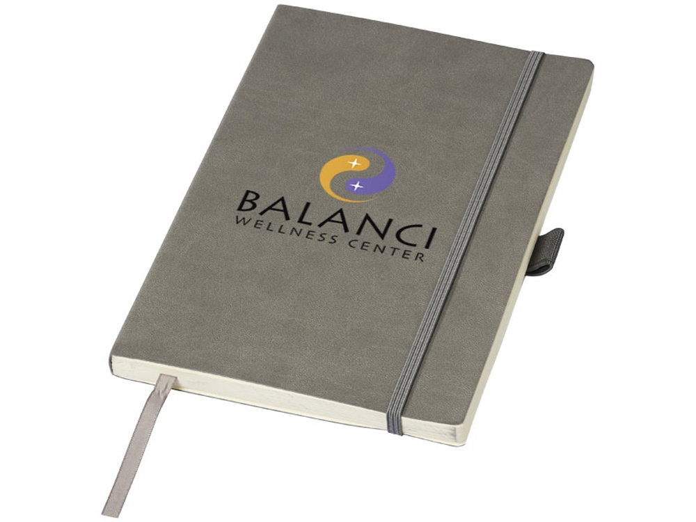 Блокнот Revello. Мягкий на ощупь, гибкий блокнот (размер А5 для ориентации) со встроенной эластичной застежкой, закладкой, петелькой для ручки и кармашка для документов на внутреннем форзаце сзади. 80 листов кремовой линованной бумаги (80г/м2). Упакован в черную коробку-рукав. Кожа ПУ. -