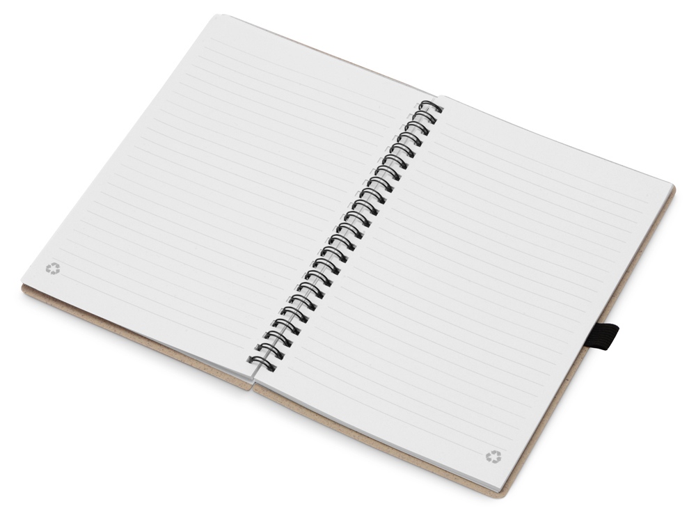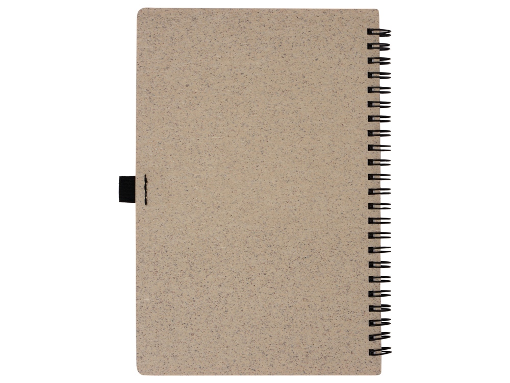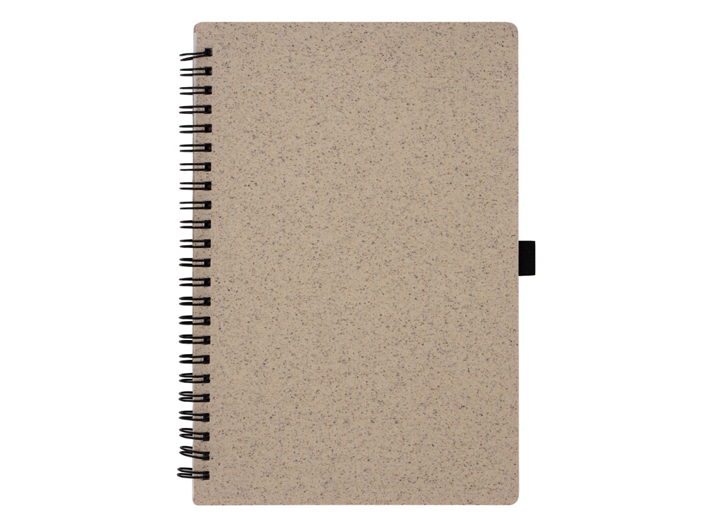 Блокнот с обложкой из переработанной пшеницы и пластика. Блок состоит из 70 листов переработанной бумаги белого цвета. Крепление - пружина. Дополнен петлей для ручки. -