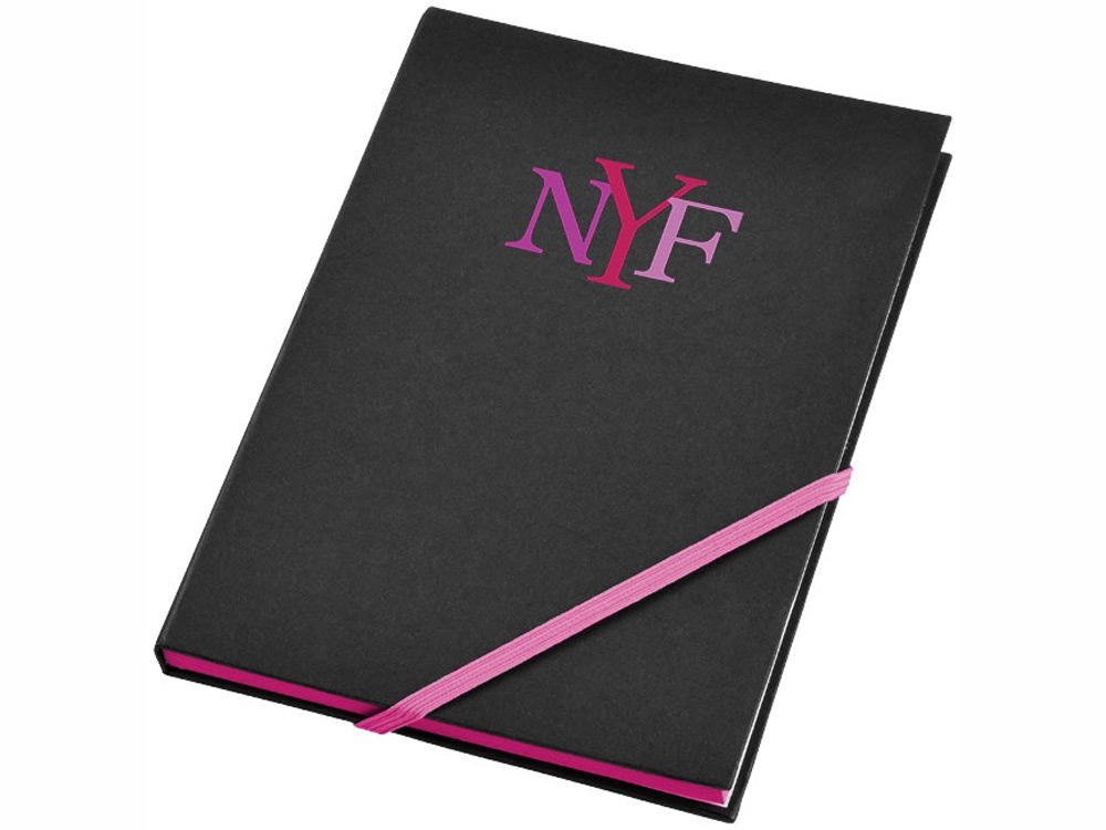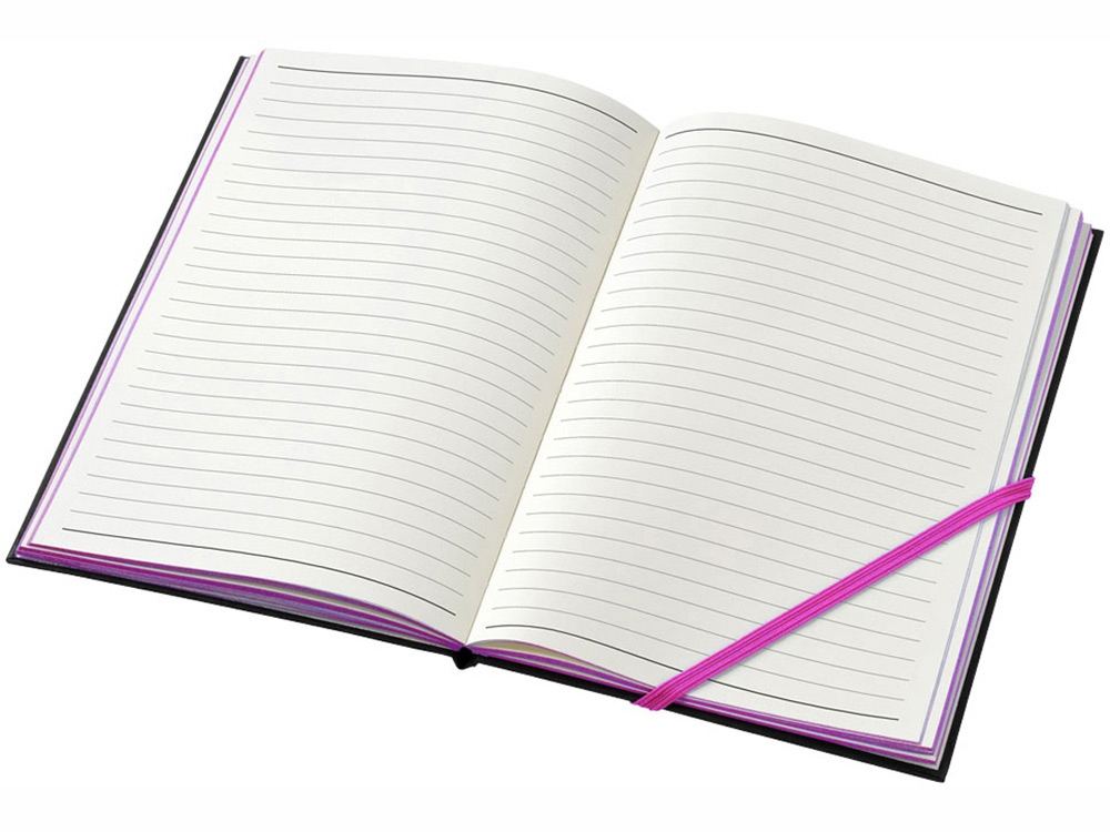 Блокнот, ориентировочный формат A5 с 80 листами бежевой бумаги (70 г/м²) с диагональной эластичной застежкой и яркими неоновыми краями. -