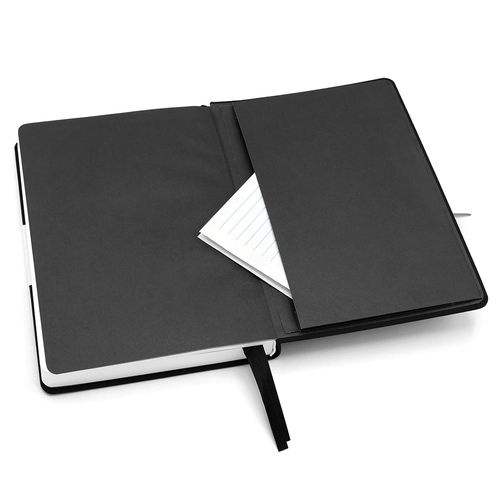 Блокнот А5-формата жёсткой обложке со специальным гладким покрытием. Материал обложки — полиуретан. Карман в нахзаце, форзац, двойное ляссе, эластичная застёжка — всё комплиментарно цвету обложки. Размеры: 150*214*24 мм, 384 разлинеенные страницы / 192 листа, бумага плотностью 70г/м2. В кармане можно переносить визитки, купоны и т.д.- Виды нанесений: УФ-печать А2, Гравировка CO2-А2, Тиснение, Тиснение фольгой, УФ-Лак, УФ-Цвет+Лак