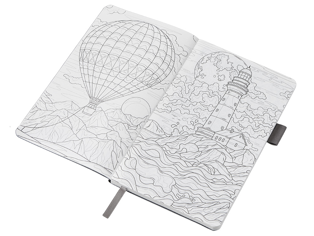Необычный для блокнота вводный блок включает трекер привычек, списки книг и фильмов, а также 4 страницы для раскрашивания с картинками и мандалами.